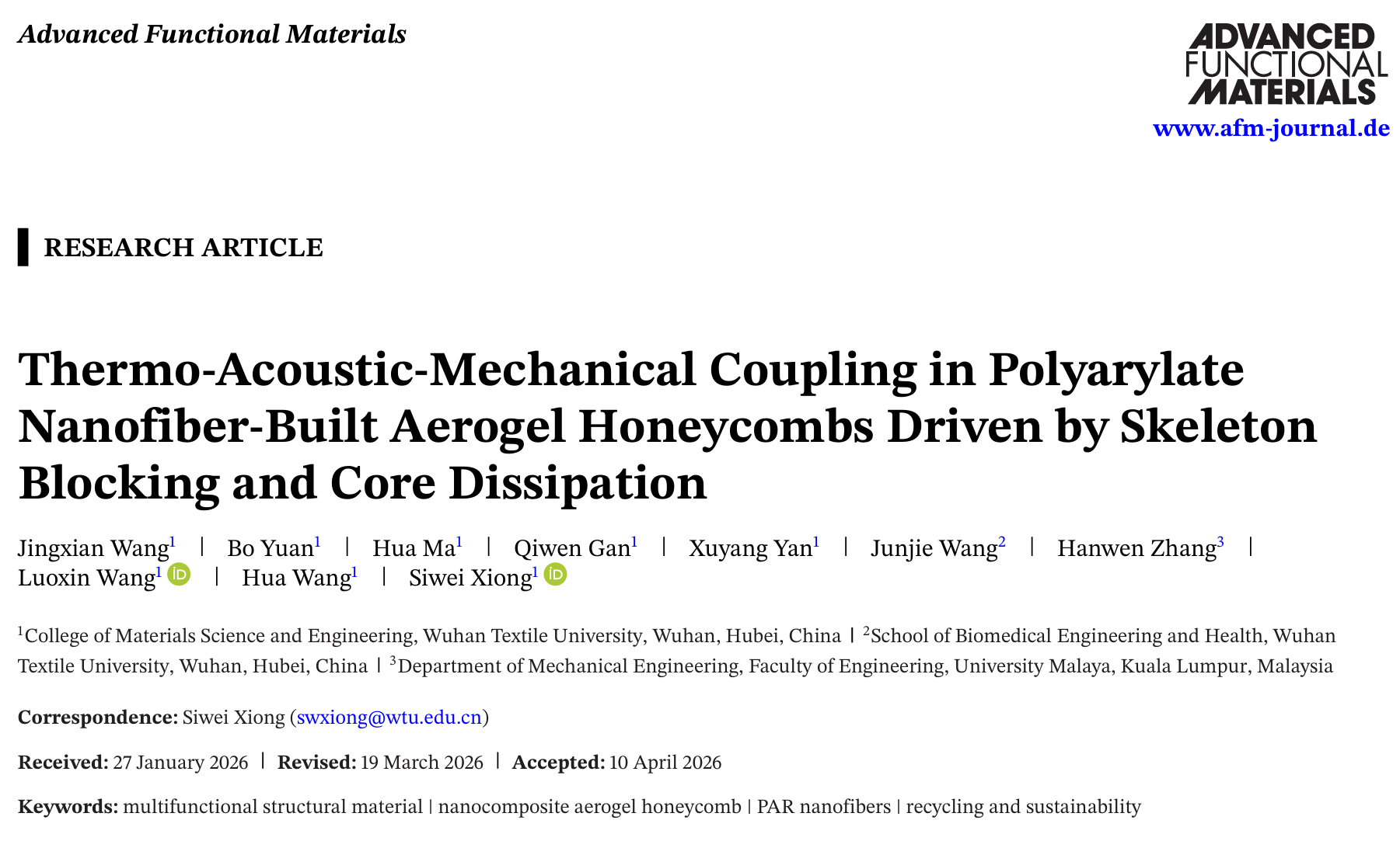 近日,材料学院王桦/王罗新团队熊思维副教授在Advanced Functional Materials发表题为“Thermo-Acoustic-Mechanical Coupling in Polyarylate Nanofiber-Built Aerogel Honeycombs Driven by Skeleton Blocking and Core Dissipation”。论文第一作者为硕士生王敬贤,通讯作者为熊思维副教授,武汉纺织大学为第一完成和通讯单位。