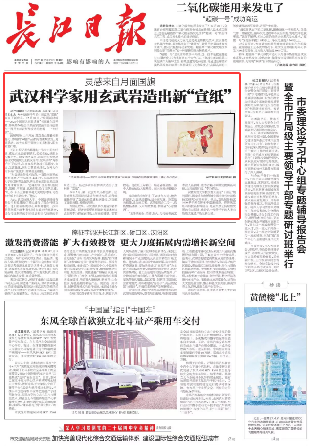 “对宣纸进行技术改良,一直是书画界的重要课题。”王铁汉说,2024年,由武汉纺织大学徐卫林院士团队研发的玄武岩五星红旗在月球背面展开。它薄而软,强而韧,能防潮、阻燃、不易皱,这些特性给了团队灵感。“纸、布、石头三种看似毫无关联的材料,可在玄纤纸上共融共生。”他说。