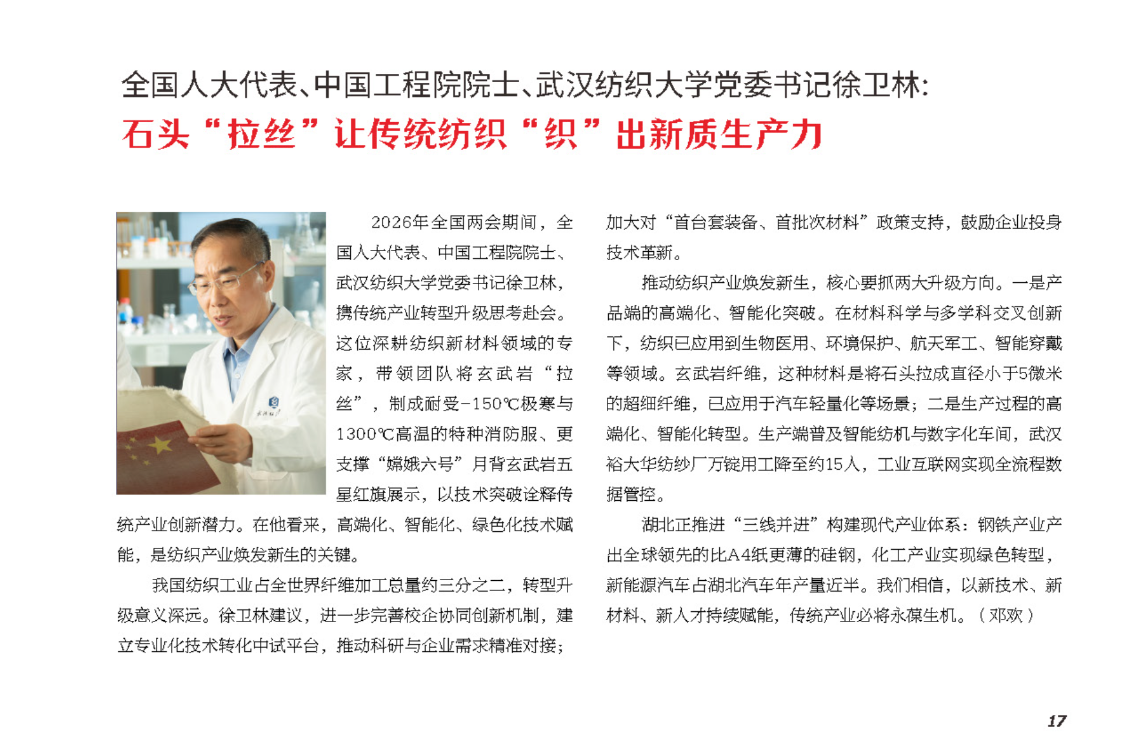 2026年全国两会期间,全国人大代表、中国工程院院士、武汉纺织大学党委书记徐卫林,携传统产业转型升级思考赴会。这位深耕纺织新材料领域的专家,带领团队将玄武岩“拉丝”,制成耐受-150℃极寒与1300℃高温的特种消防服、更支撑“嫦娥六号”月背玄武岩五星红旗展示,以技术突破诠释传统产业创新潜力。在他看来,高端化、智能化、绿色化技术赋能,是纺织产业焕发新生的关键。