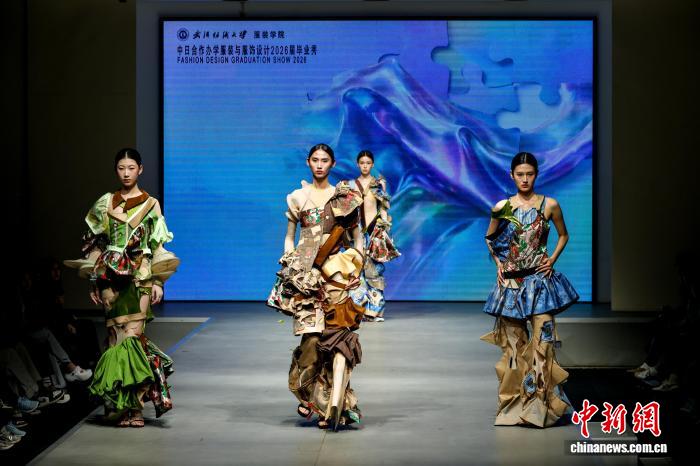 4月20日,2026年“我们的时代”武汉纺织大学时装周在该校南湖校区服装学院表演厅开幕。本届时装周旨在以青年创意为核心,融合可持续理念与数字科技,探索时尚设计的未来。时装周期间共呈现246名毕业生的869套原创设计作品。图为模特展示设计作品走秀。中新社记者 张畅 摄