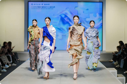本次时装周为期6天、8场主题展演,通过“用数字科技赋能时尚,传统文化活化创新、创意解构焕新设计、可持续设计理念”四个篇章,展示服装学院人才培养成果。106名专业模特倾情演绎,队伍阵容实力雄厚,不乏世界旅游文化小姐中国赛区冠军、中国时装模特大赛冠军、海上丝路国际超模大赛冠军、中国大学生服装模特大赛一等奖等行业佼佼者。