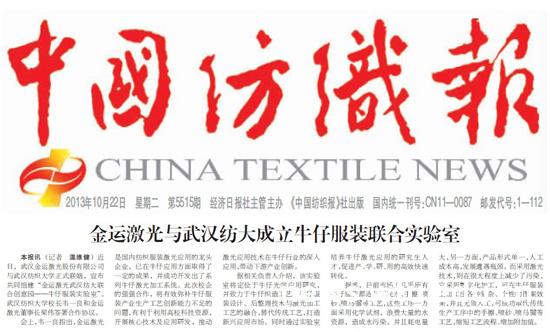 本报讯(记者 温维健) 近日,武汉金运激光股份有限公司与武汉纺织大学正式联姻,宣布共同组建“金运激光武汉纺大联合创意园——牛仔服装实验室”。武汉纺织大学校长韦一良和金运激光董事长梁伟签署合作协议。
