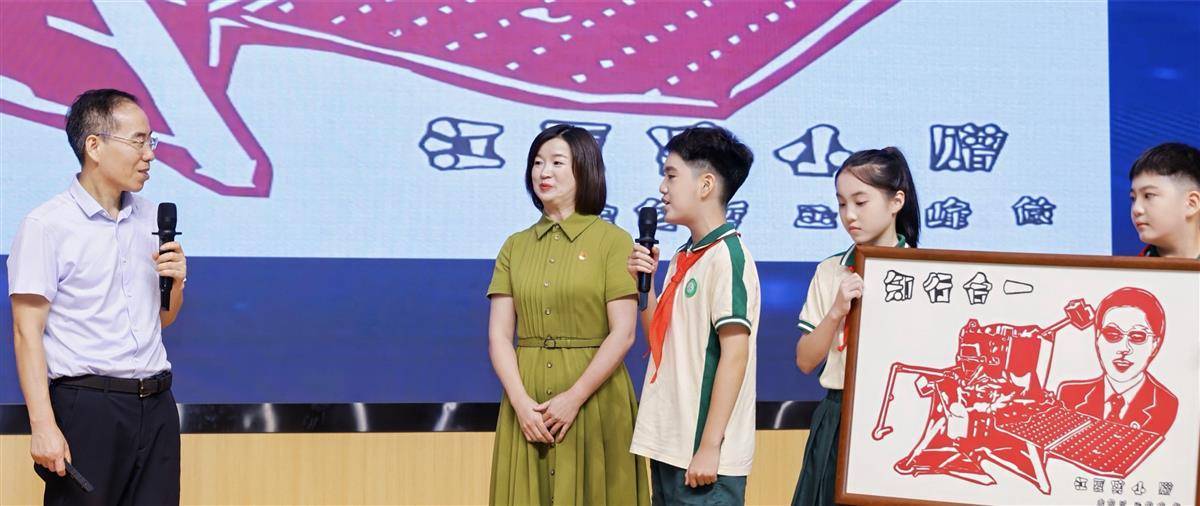 在“致敬院士”环节,师生们竞相为徐卫林送上了原创作品。江夏区实验小学古驿路校区的同学们带来了精美的原创剪纸作品《梦开苍穹,志在千里》,巧妙的构思、流畅的线条,赢得现场阵阵点赞声。江夏实验高中的同学献上了原创绘画作品《智纺五星红旗我们成功了!》,再现了徐卫林团队潜心研究、攻坚克难的生动场景。6名从江夏实验高中毕业、考入武汉纺织大学的同学为徐卫林送上了鲜花。