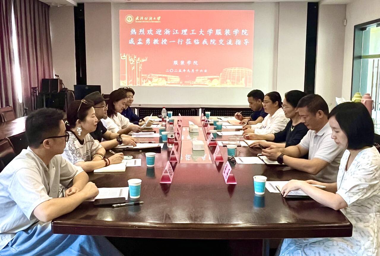 9月16日上午,浙江理工大学服装学院戚孟勇教授一行来到我校服装学院,双方围绕学科建设、研究生教育、专业建设、实验室建设等议题进行了深入交流。服装学院院长陶辉、副院长江学为、办公室主任胡琳琳、设计一系主任张丹、实验室主任吴胡和参加了此次会议。