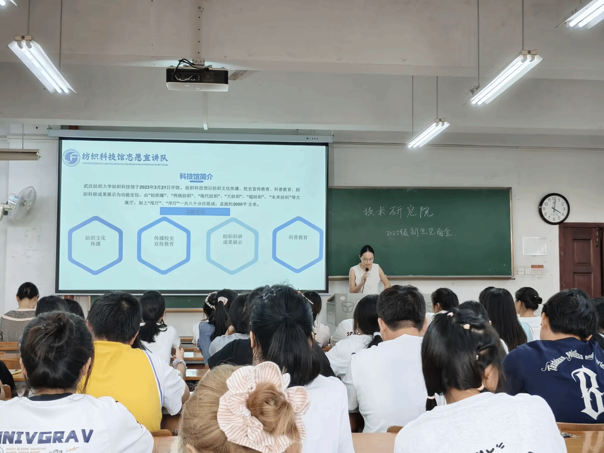 随后,技术研究院研究生会主席曾靖涵从组织架构、品牌活动、学术资源整合三方面,系统介绍了研会“服务同学、联结师生”的核心功能,并正式向新生发出招新邀请。纺织科技馆志愿宣讲队的范可心同学则详细介绍了宣讲队的建设历程与管理模式,号召新生积极加入,在志愿服务中锤炼综合能力,以“用科普讲好纺织强国梦”的担当践行青春使命。