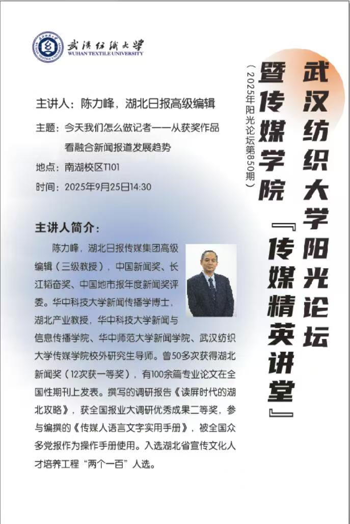 9月25日,武汉纺织大学阳光论坛第850期暨传媒学院第1期“传媒精英讲堂”在南湖校区T101教室顺利举办。本论坛以“今天我们怎么做记者一一从获奖作品看融合新闻报道发展趋势”为主题,由湖北日报高级编辑、三级教授陈力峰主讲,传媒学院副院长马庆主持。此次论坛讲座吸引了传媒学院60余名师生参与,现场交流氛围浓厚。
