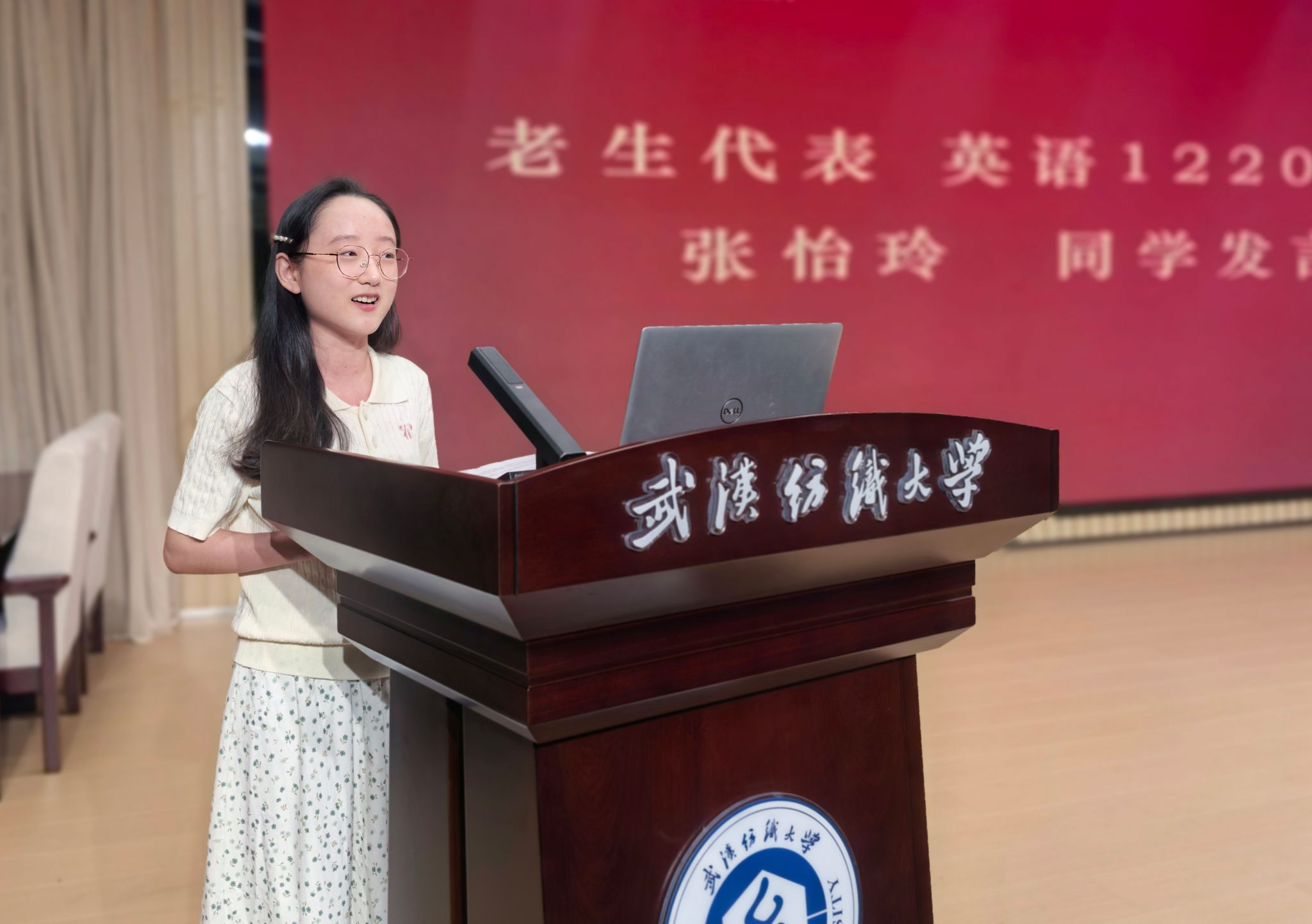 优秀学生代表、英语专业大四学生张怡玲以“抓紧每一寸光阴,让成长掷地有声”为题,分享了从大一勇于尝试到大三收获满满的成长历程。她以专四全国最高分、CATTI二级笔译证书、保研华中师大等优异成绩,激励学弟学妹珍惜时光,用坚持书写无悔青春。