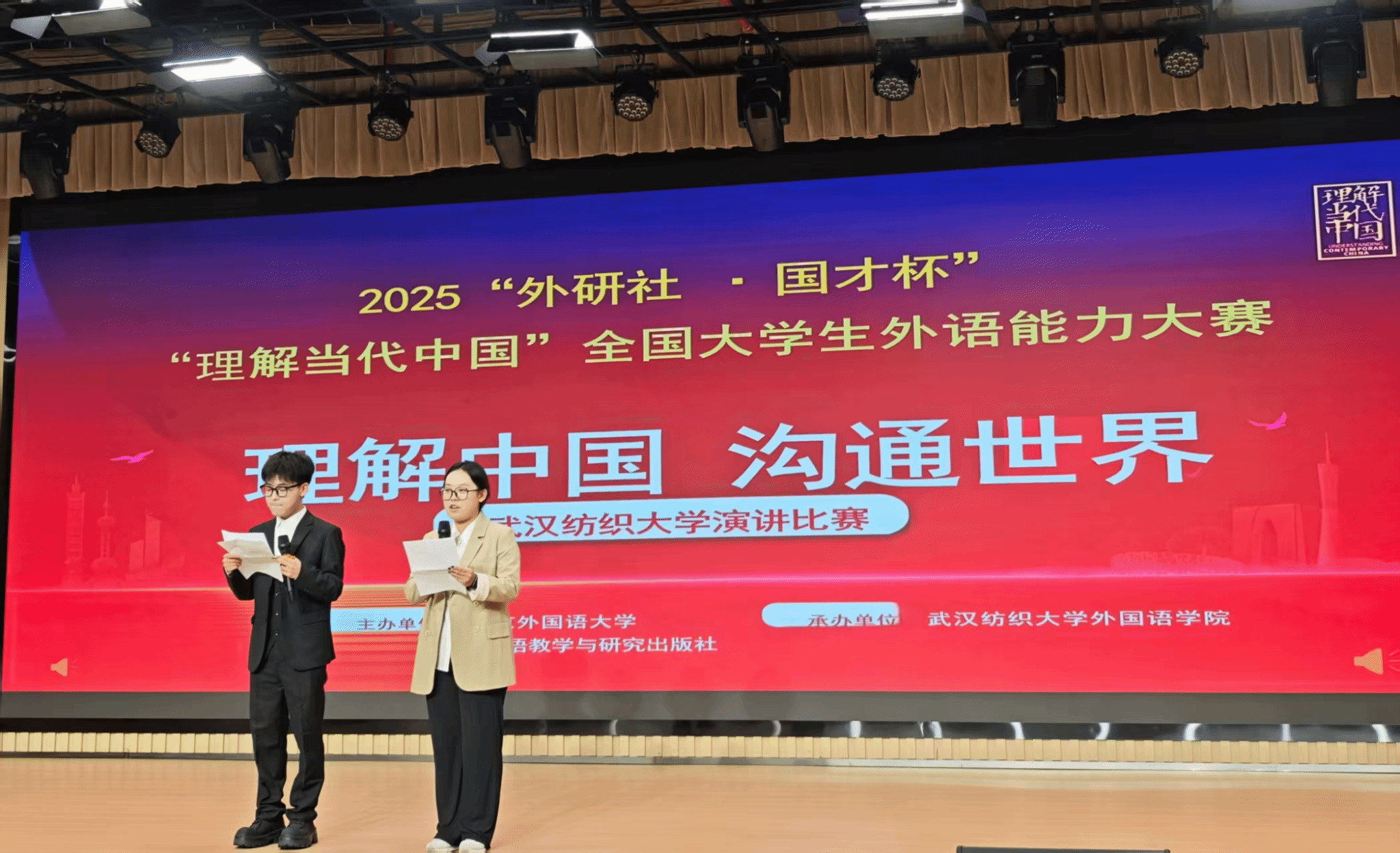 2025年“外研社·国才杯”“理解当代中国”全国大学生外语能力大赛武汉纺织大学英语演讲决赛暨外语文化节活动于10月9日下午在建全会堂圆满落幕。外国语学院院长谭燕保教授、副院长罗绮伦副教授、副书记彭阳慈航出席活动。比赛由英语专业24级崔嘉靖同学与23级王依荷同学担任主持人。本次比赛紧扣“理解中国,沟通世界”的大赛宗旨,以“Striking the Waves”为主题,充分展现了我校学子扎实的外语功底、深厚的家国情怀与卓越的综合素养。