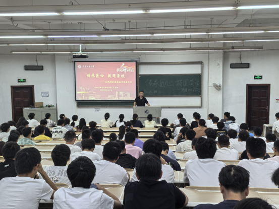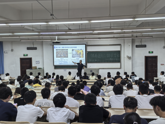 干文勋从“胸怀家国、情系纺大、根植学院、扬帆起航”四个维度展开阐述:一是“胸怀家国——在时代坐标中锚定青春方向”,他以“制造大国”到“制造强国”转型为切入点,结合武汉纺大助力“天问一号”的高温弹性密封装置、支撑柔性屏研发的玻璃纤维加机等实例,点明机械学科是大国重器的“脊梁”,勉励新生以所学助力国家科技进步;二是“情系纺大——在历史传承中筑牢身份认同”,回顾学校从武汉纺织工学院到武汉纺织大学的发展历程,解读“自强不息、经天纬地”的纺大精神,通过学科排名、科研平台等成果,强化新生的“纺大身份”自豪感;三是“根植学院——在专业沃土中锻造过硬本领”,从学院1978年沿革说起,介绍机械专业获批国家一流专业、获国家科技进步二等奖等成就,提及梅顺齐院士等师资团队与实训平台,并以张定宏、陈立平等杰出校友为例,激发新生奋斗动力;四是“扬帆起航——在崭新起点上书写无悔青春”,向新生提出四点期望:“志存高远”融入国家战略,“勤学笃行”参与实践竞赛,“修身立德”传承纺大精神,“勇于创新”突破技术极限,寄语大家成长为支撑国家发展的“机械力量”。