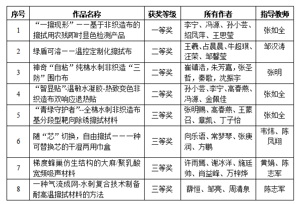 表1 非织造专业第十三届“金三发 德祐”杯双创大赛获奖名单