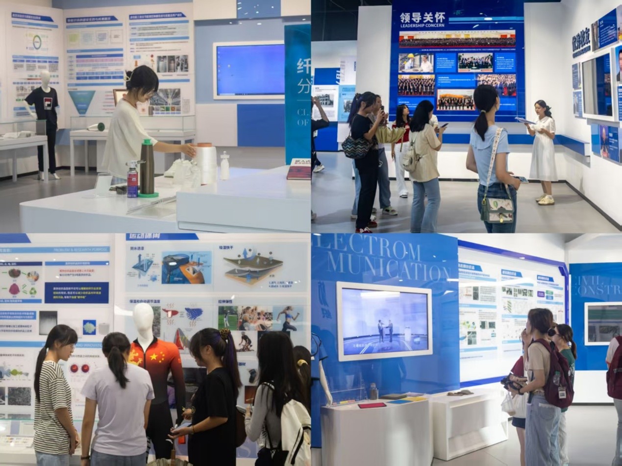 从嫦娥六号玄武岩织物到航空航天纺织品,从医学纺织到特殊环境服装,同学们近距离观察到纺织重大工程领域的关键作用。在国防教育馆的“参军光荣”主题展区,许多同学驻足交流,在专业学习与强国使命之间建立起真切的情感联结。