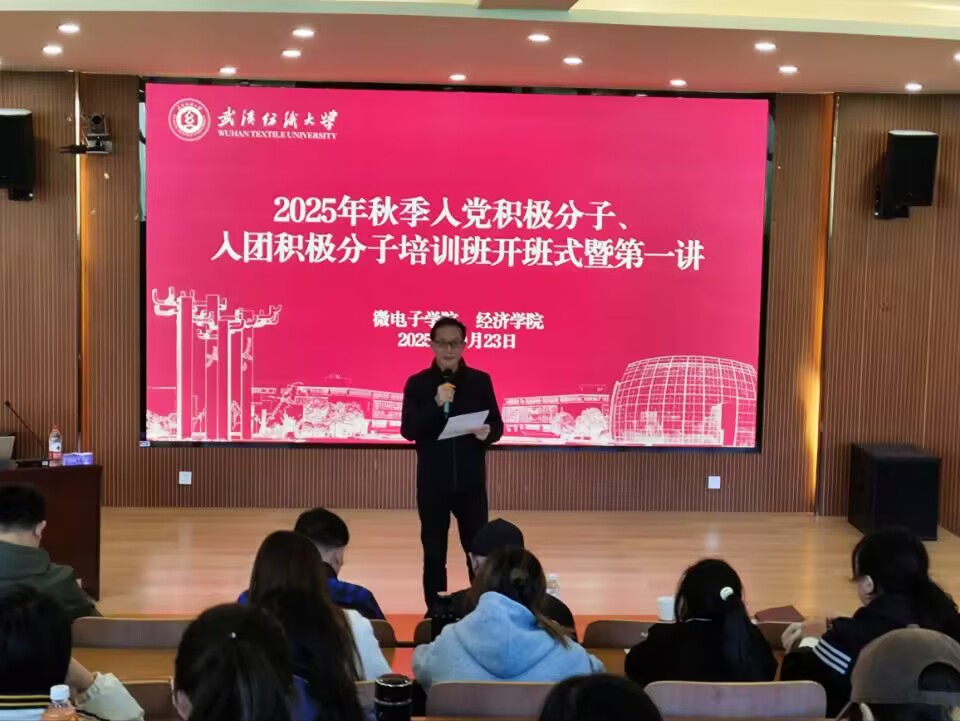 为进一步加强青年大学生的思想政治引领,筑牢理想信念根基,10月23日,正值党的二十届四中全会胜利闭幕之际,微电子学院与经济学院联合举办的2025年秋季入党、入团积极分子培训班开班仪式暨第一讲在崇德楼T301报告厅举行。武汉市“五老报告团”副团长、武汉纺织大学关工委常务副主任王金华教授出席开班仪式并授课。两个学院的党委书记、副书记、相关辅导员及全体党校、团校学员参加。开班仪式由微电子学院党总支书记周平主持。