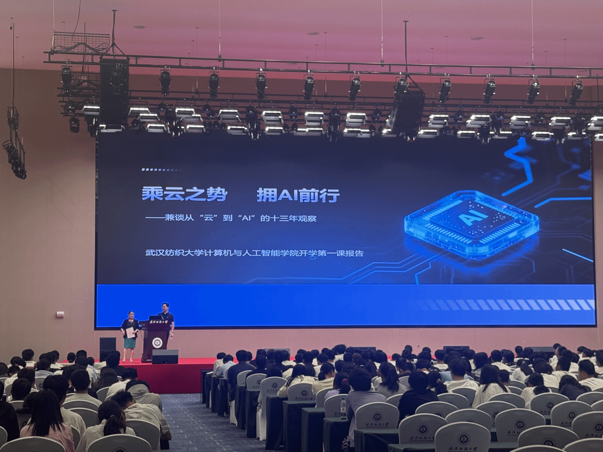 随后,金山云研发中心总经理贾涛为新生们带来了题为《乘云之势,拥AI前行——兼谈从“云”到“AI”的十三年观察》的专题讲座。贾涛结合自身在行业深耕十三年的丰富阅历与深刻洞察,生动描绘了从云计算到人工智能的技术演进与融合趋势图景。他深入剖析了这一技术脉络对产业发展的深远影响,并精辟地指出,理解和把握这一技术发展脉络,是未来计算机领域人才构建核心竞争力的关键。他勉励在场新生,要主动洞察并拥抱技术浪潮,在校期间扎实夯实专业基础,力争从智能时代的学习者、适应者,成长为未来的创造者和引领者。