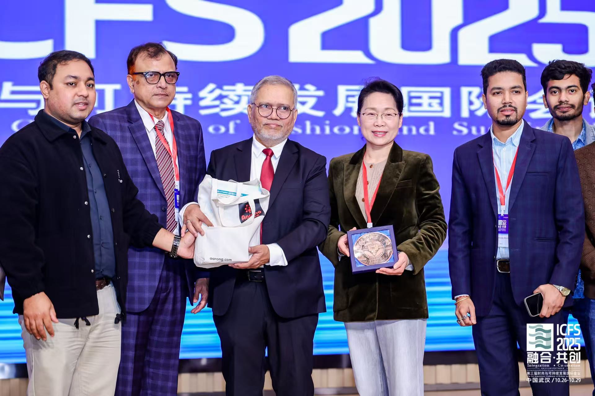 (武汉纺织大学服装学院院长与孟加拉国友人合影留念)