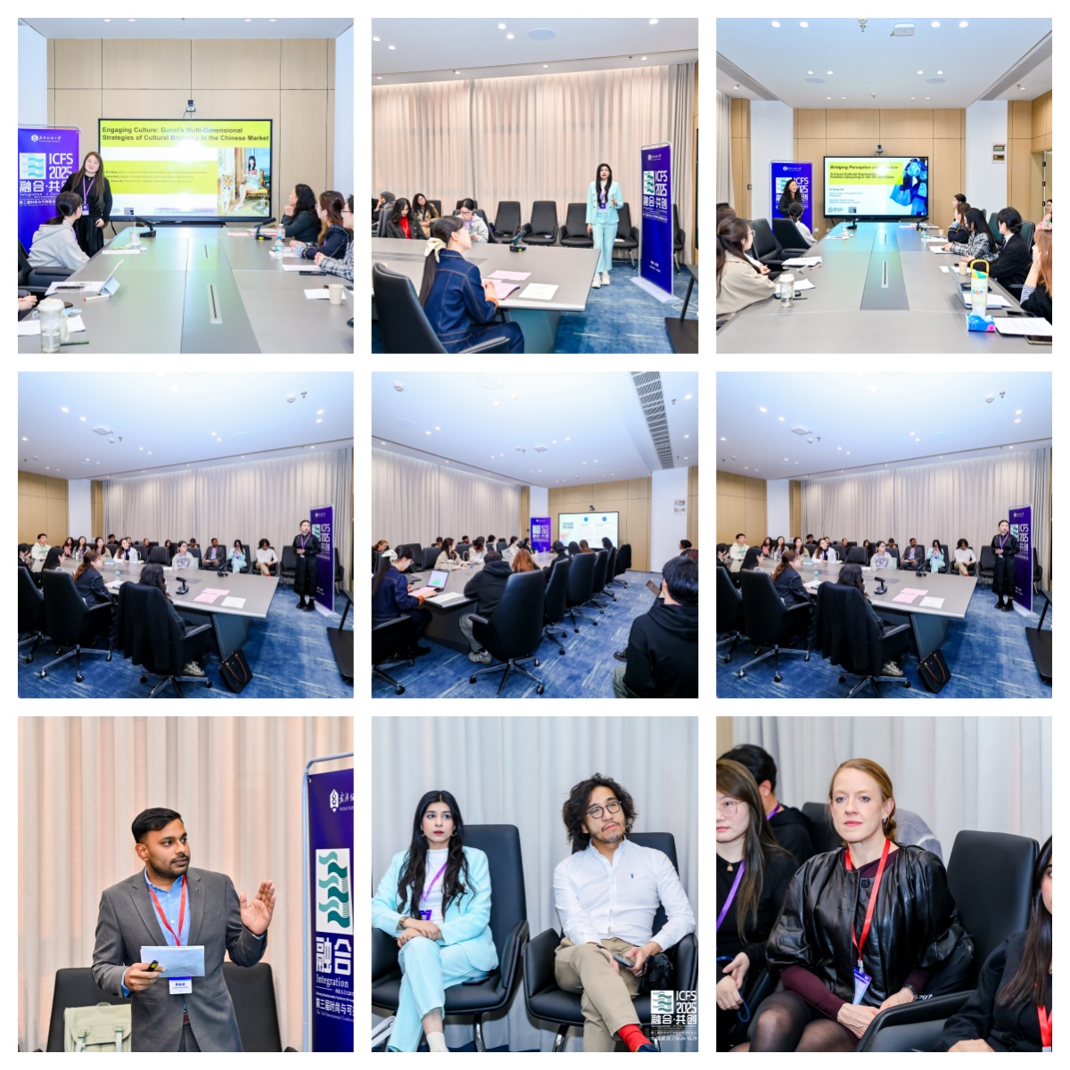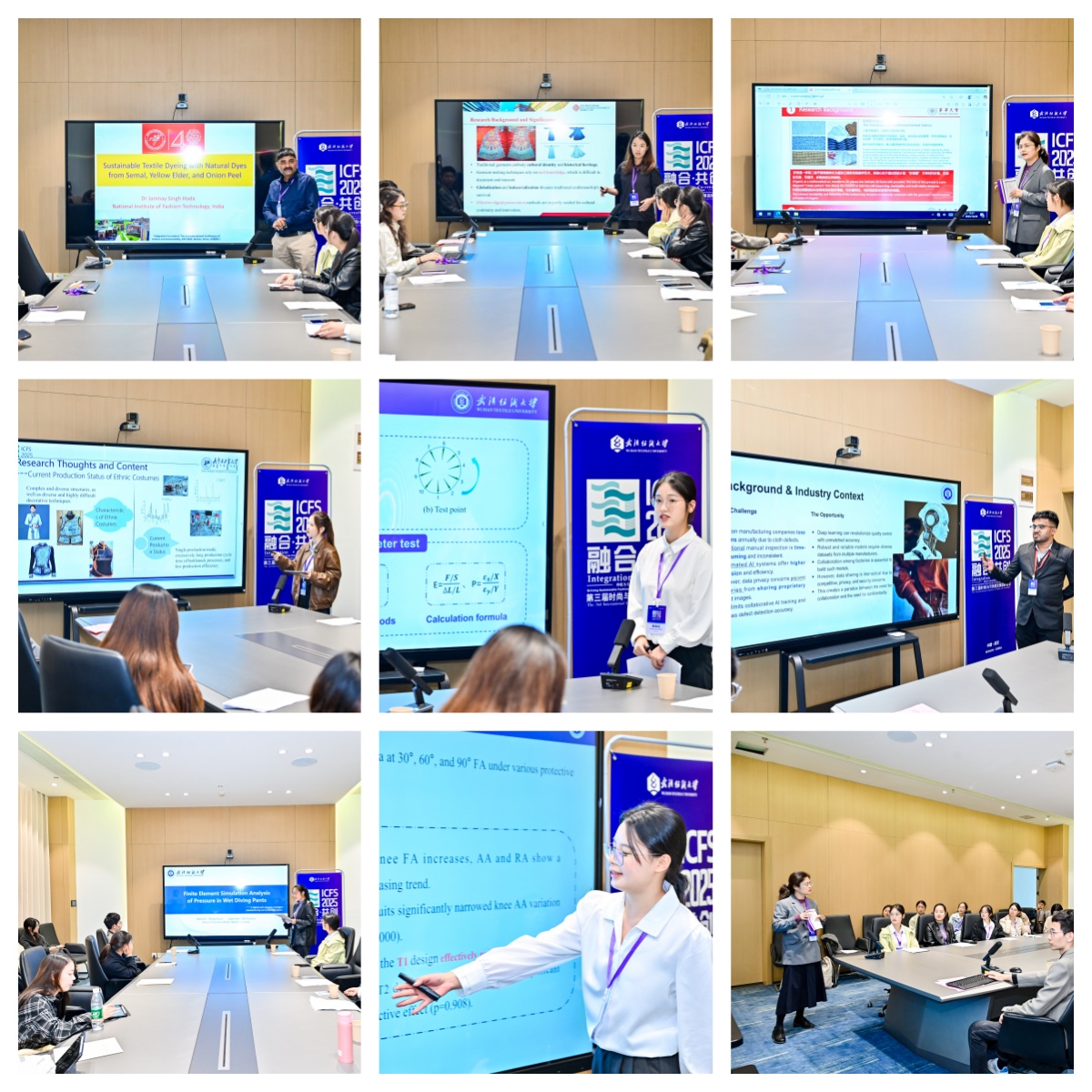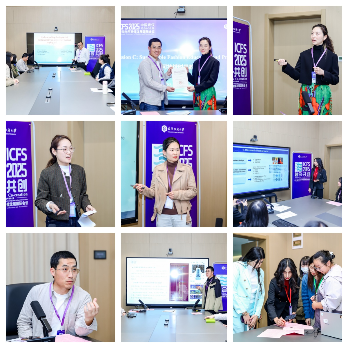 “文化传承与创新(Cultural Inheritance and innovation)”分会场(阳光厅)以“传统元素的现代时尚转化”为核心,构建中外文化交流对话平台。国内学者深耕本土文化价值挖掘:安徽职业技术学院系统剖析清代内袍形制演变中的权力象征与身份内涵,为传统服饰传承提供历史参照;内蒙古工业大学以蒙古族文化为核心,借助虚拟博物馆、AIGC技术实现非遗数字保存与创新表达;武汉纺织大学则将湖北蓝染、楚国天文星象纹等地方非遗与传统意象融入童装、女装及环保文创设计,推动非遗活态传承与低碳理念落地。国际视角进一步拓宽交流边界:英国曼彻斯特城市大学解析国际奢侈品牌在华文化适配策略,中巴学者联合开展传统婚纱、拼布工艺跨文化再造研究,展现多元文化共生活力。与会嘉宾共识,文化传承是可持续时尚的精神内核,需以创新为纽带链接传统与现代。