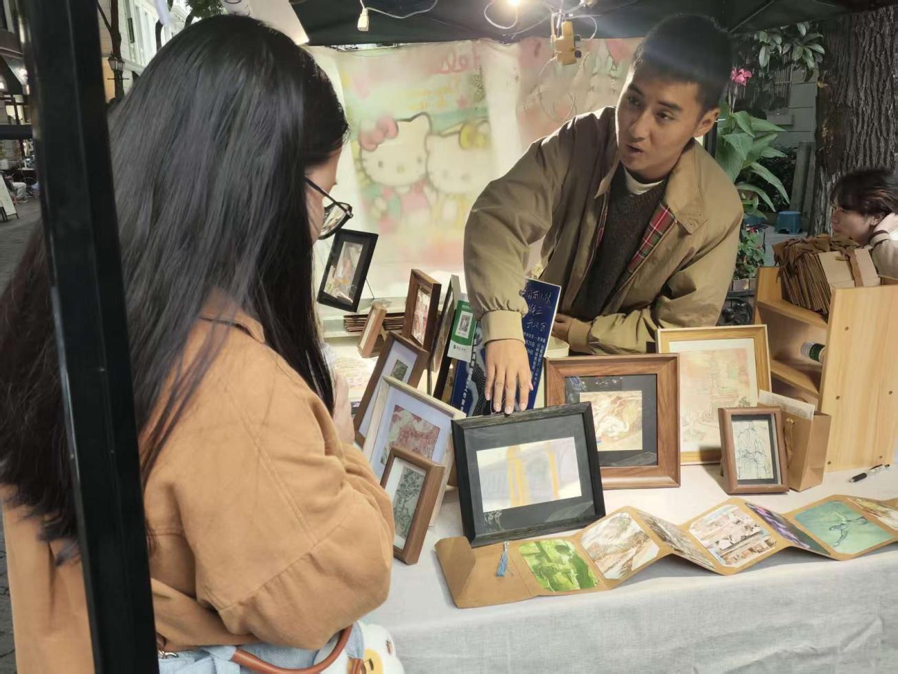 时值金秋,设计学院观意ADB工作室积极开展多项社会实践活动。从重阳节的社区敬老,到市集的文创快闪,工作室的同学们致力于推动传统文化与现代设计的融合创新。在近日于黎黄陂路文创街区举办的快闪市集实践中,学院学生参加书画协会交流活动,围绕“传统书画与现代文创碰撞”的主题展开深入互动。