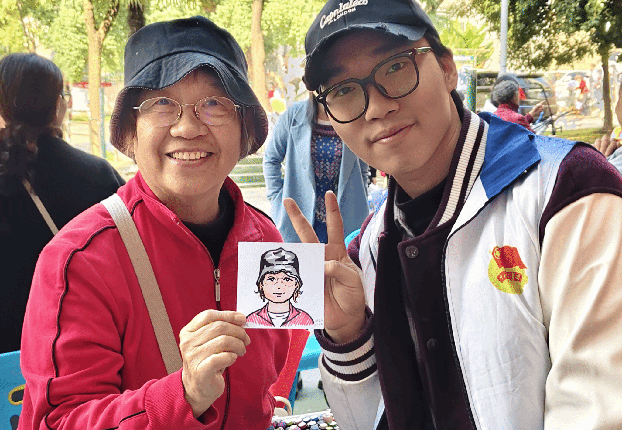活动现场设置四个互动体验区,包含趣味运动、精美书画、手工创意和音乐海洋。老教师们随健身操节奏活动身体,热情洋溢,还有一位老爷爷带领志愿者们打起太极,刚柔并济间传递着健康理念;挥毫书写毛笔字,“养老敬老好”“健康快乐”是最美的祝福;当《歌唱祖国》《映山红》的旋律响起,师生同唱,掌声与歌声交织成光;绘画专业志愿者们则用画笔定格笑靥,手工志愿者协助老师们亲手制作独一无二的秋日书签,一幅幅唯美肖像画和一张张专属书签成为老师们最珍贵的节日礼物。