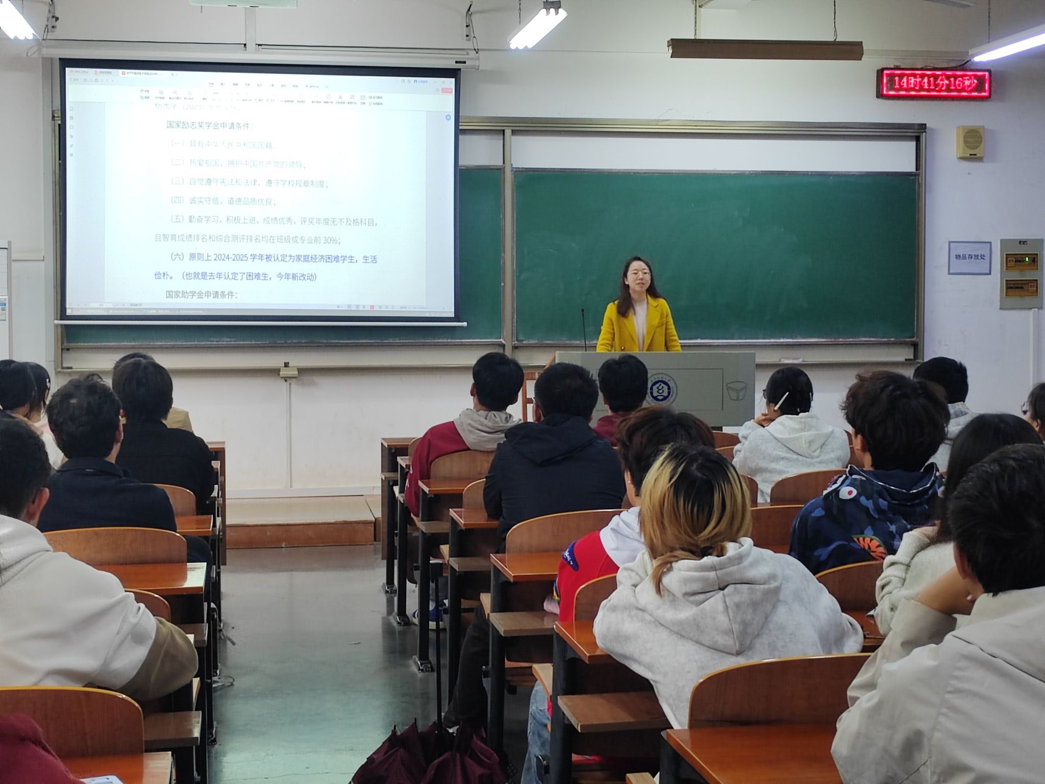 宣讲培训环节,卫周瑶按照学校下发的文件,对本年度评选工作进行了条理清晰、重点突出的详细讲解。在资助政策上,她详细介绍了国家助学金不同等级的设置标准、申请资格,以及规范的申请与认定流程,特别说明了家庭经济困难学生认定的民主评议与学院审核环节,确保资助资源真正用于需要帮助的学生。对于国家励志奖学金,卫老师也逐一介绍了其设立宗旨、评选办法和具体流程,鼓励同学们在打好学业基础的同时,积极参与各类活动,争取全面发展。除了政策解读,卫老师还就同学们普遍关心的申请材料准备、系统填报注意事项、评审时间节点等实操性问题进行了答疑,提醒同学们务必秉持诚信原则,如实填报信息,严禁弄虚作假。