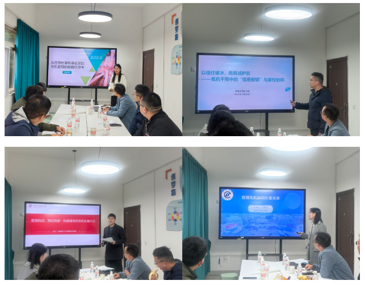 纺织学院薛萍老师以《从应急处置到事前预防:危机管理的前瞻性思考》为题,通过对典型心理危机事件的系统复盘,强调校园安全管理应树立“防患于未然”的理念,通过完善制度机制、加强日常排查、实施分类施策、深化家校协同,构建“早发现、早干预、早化解”的全流程工作闭环。微电子学院方林老师以《以信任破冰,用真诚护航——危机干预中的“信息密钥”与家校协同》为题,从心理育人和沟通策略角度出发,分享了在危机干预中如何与学生建立信任关系、走进学生内心,实现“情感介入”与“问题疏导”的有机统一。机械学院徐智航老师围绕《直面挑战、稳住阵脚:构建辅导员危机处置办法》,系统梳理了危机发生后的标准化应对流程,强调在复杂情境中保持冷静判断、依法依规处理,并提出了“情景模拟+复盘推演”的能力提升路径。经济学院马晓雪老师则以《校园危机协同处置实战录》为题,结合真实案例,深入剖析了多部门联动与家校医协同在危机处置中的关键作用,指出信息畅通、角色清晰、资源整合是提升协同处置效能的核心要素。