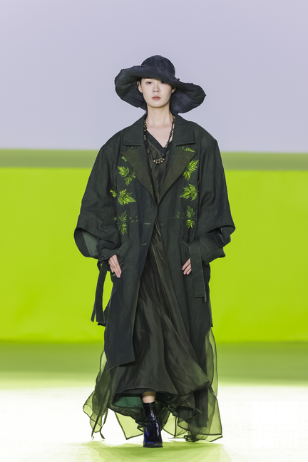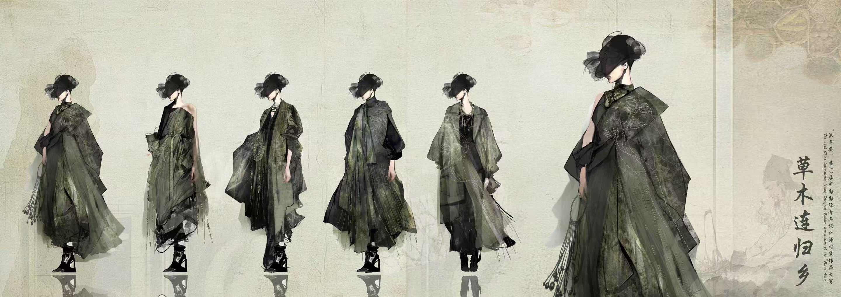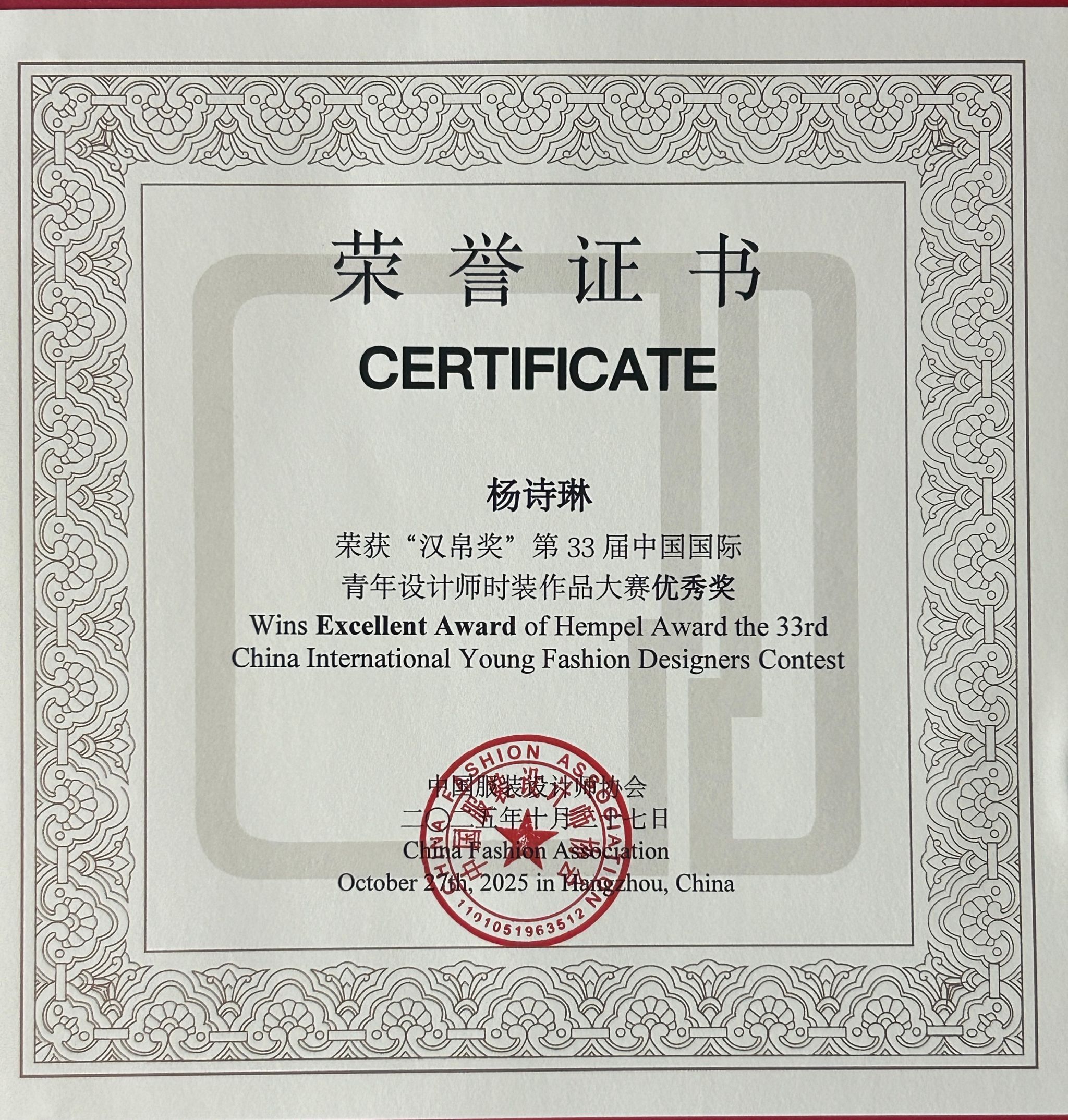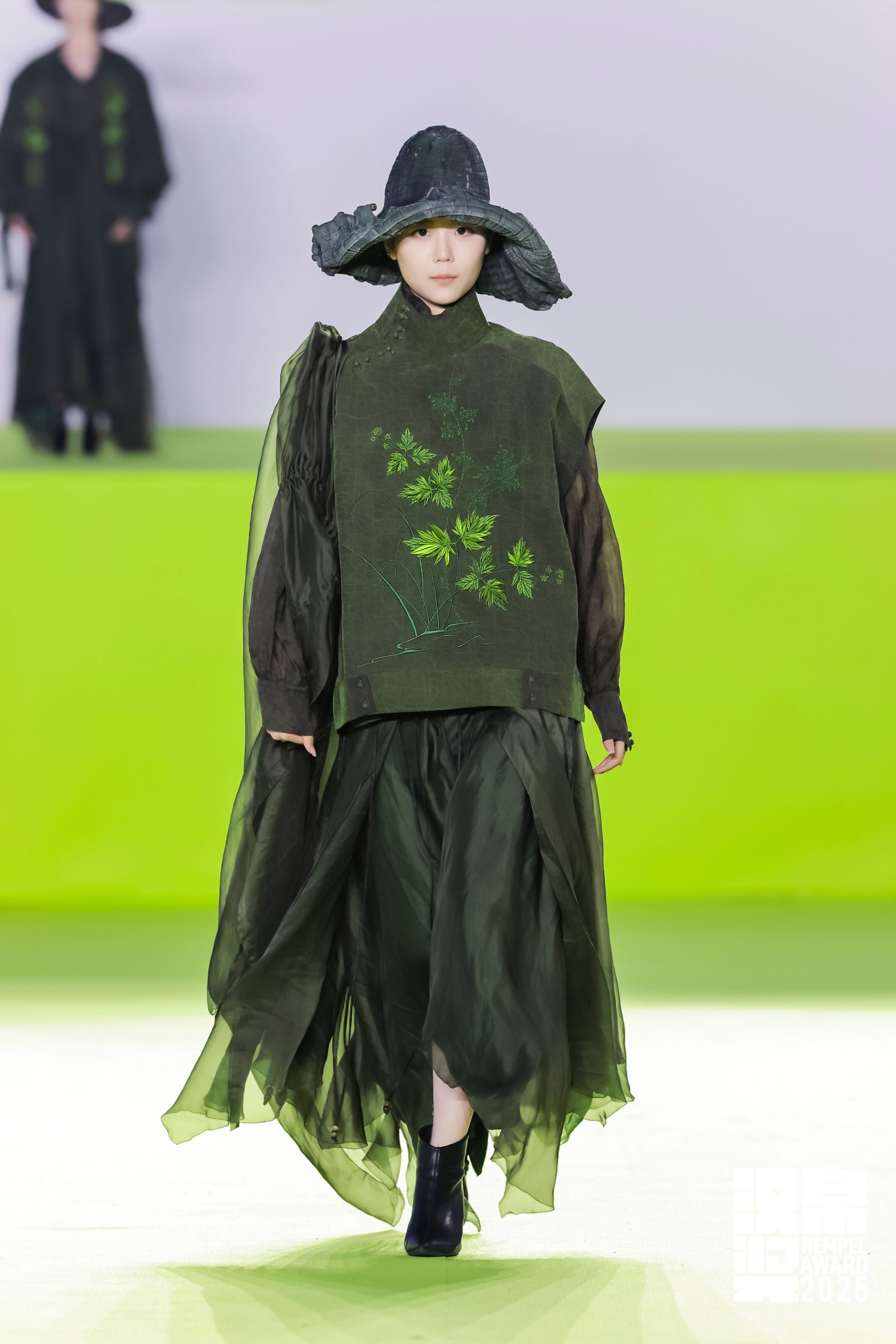 10 月 27 日晚,一场别开生面的时尚盛会在杭州拉开帷幕。汉帛奖·第 33 届中国国际青年设计师时装作品大赛在杭州地标——城市阳台盛大启幕。此次大赛以“全域秀场”的独特姿态,将实景建筑与虚拟时尚元素完美融合,勾勒出“势起东方,时尚杭州”的崭新图景。经过大赛专家委员会评审并报组委会审议通过,最终结果揭晓。在校2024级研究生杨诗琳取得佳绩,作品《草木连归乡》荣获优秀奖。该系列服装采用草木染工艺,将非遗缠花工艺与艾草形态巧妙融合,用缠花精细勾勒艾草模样,让传统手工艺鲜活呈现;再以非遗楚香珠点缀其间,增添灵动与文化底蕴。
