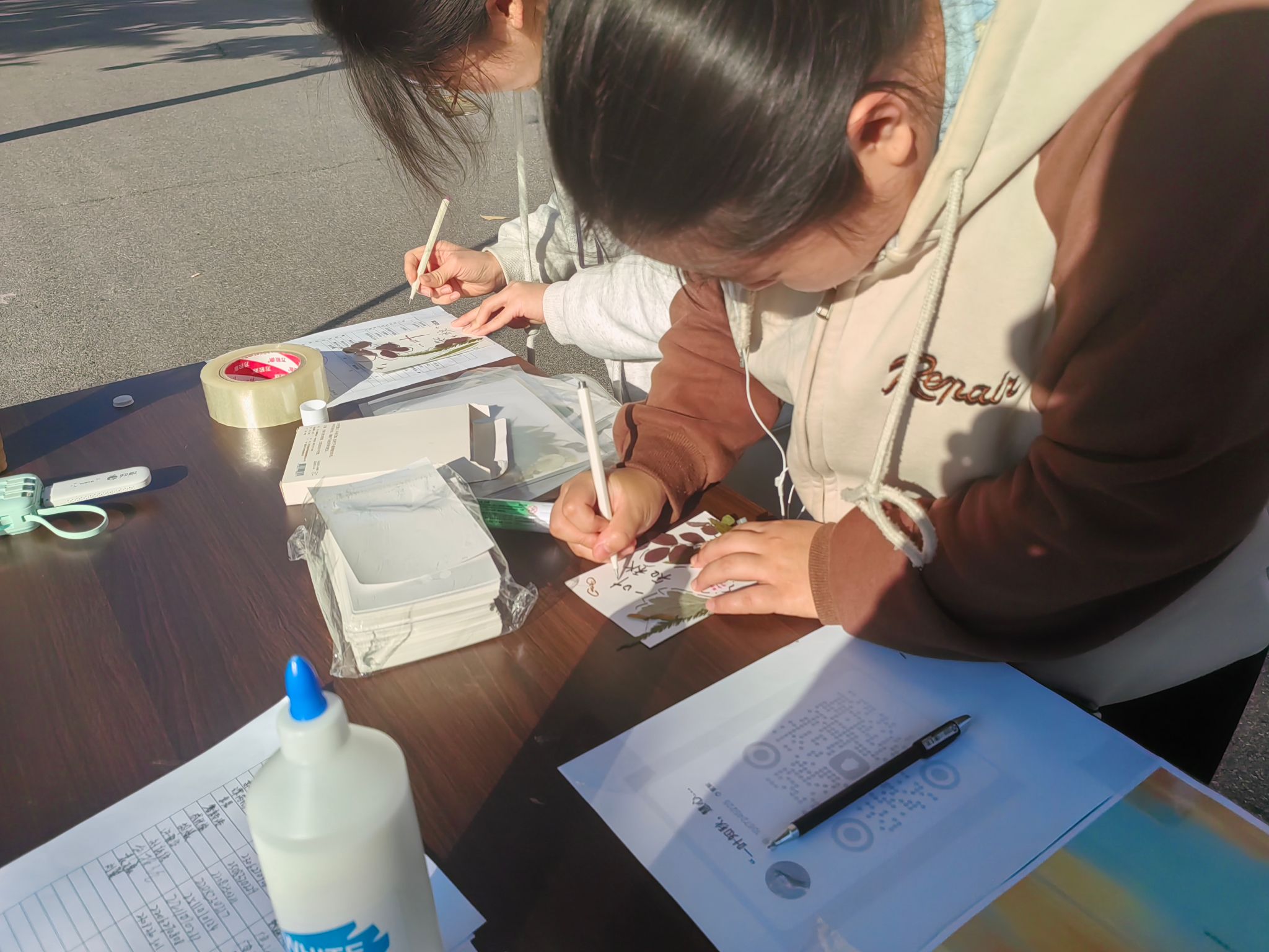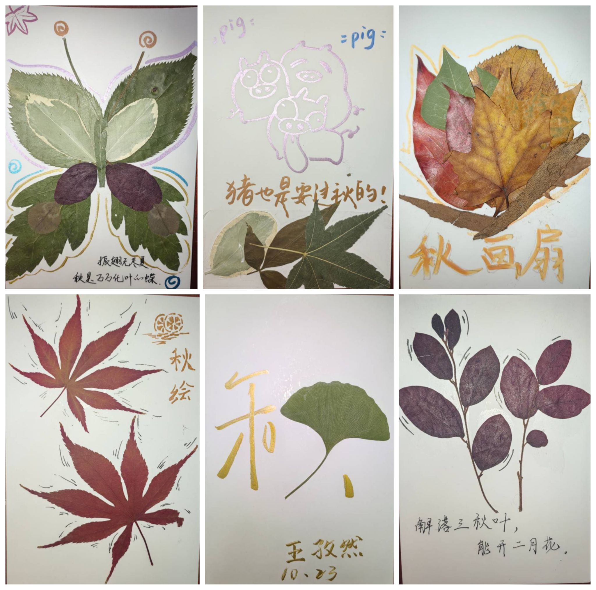 (同学们手工粘贴落叶绘制秋意)