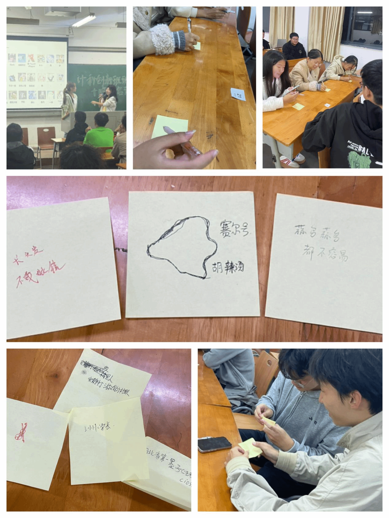 活动伊始,“看见彼此”破冰游戏迅速点燃了现场气氛。同学们被分为四组,通过“一句话标签”或“一幅图画”来展示自我特色。“考研人”、“二次元爱好者”、“王者高手”、“器乐达人”……各种充满创意的标签,伴随着各地方言和家乡特色的介绍,引发了阵阵欢笑与共鸣。在轻松愉快的互动中,同学们快速打破了初识的隔阂,增进了彼此的了解。