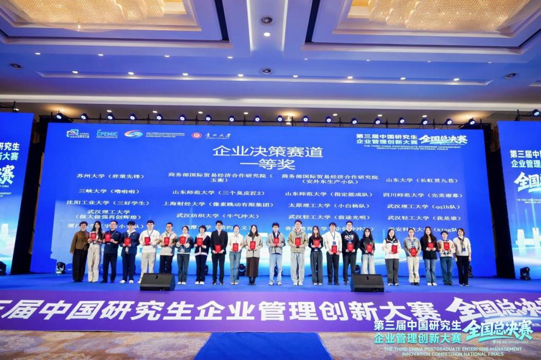 经过激烈角逐,管理学院余牛指导的“牛气冲天”队(成员:丁俊达、蔡瑾耀、陈嘉灏)荣获企业决策赛道全国一等奖、万欣指导的“开心总动员”队( 成员:刘书洋、程佳欣、张佳瑶)和魏文川指导的“奇迹小组”队(成员:郭红霞、何苹格、柯寅)分别荣获企业决策赛道全国二等奖,这得益于学校和学院的大力支持,充分体现了学院在研究生教育方面的扎实功底与育人成果。