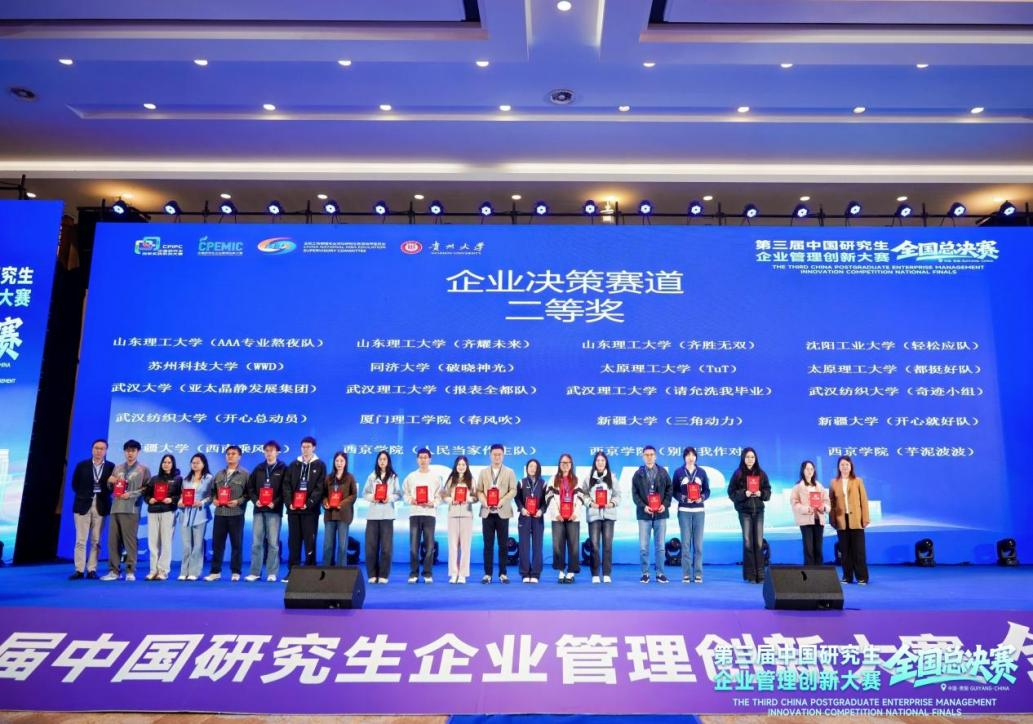 11月9日,第三届中国研究生企业管理创新大赛全国总决赛在贵阳圆满落幕,本届大赛共有来自全国150所高校的411支队伍晋级全国总决赛,管理学院师生团队获得全国一等奖一项、全国二等奖两项,刷新我校在该项赛事中的历史最佳成绩。