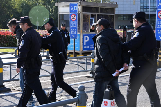 正式演练模拟“不法分子强行闯入校园”的场景。面对突发情况,门口安保人员立即阻拦并上报。保卫处防暴恐小组闻讯即动,迅速启动应急预案,在利用一键报警装置向公安机关报警的同时,立即赶赴现场。校卫队队员手持防暴盾牌、钢叉等器械,迅速组成战术队形,与“不法分子”周旋、对抗,有效控制了事态扩大。随后,迅速赶到的公安民警与校卫队协同作战,成功将“不法分子”制服并带离现场。