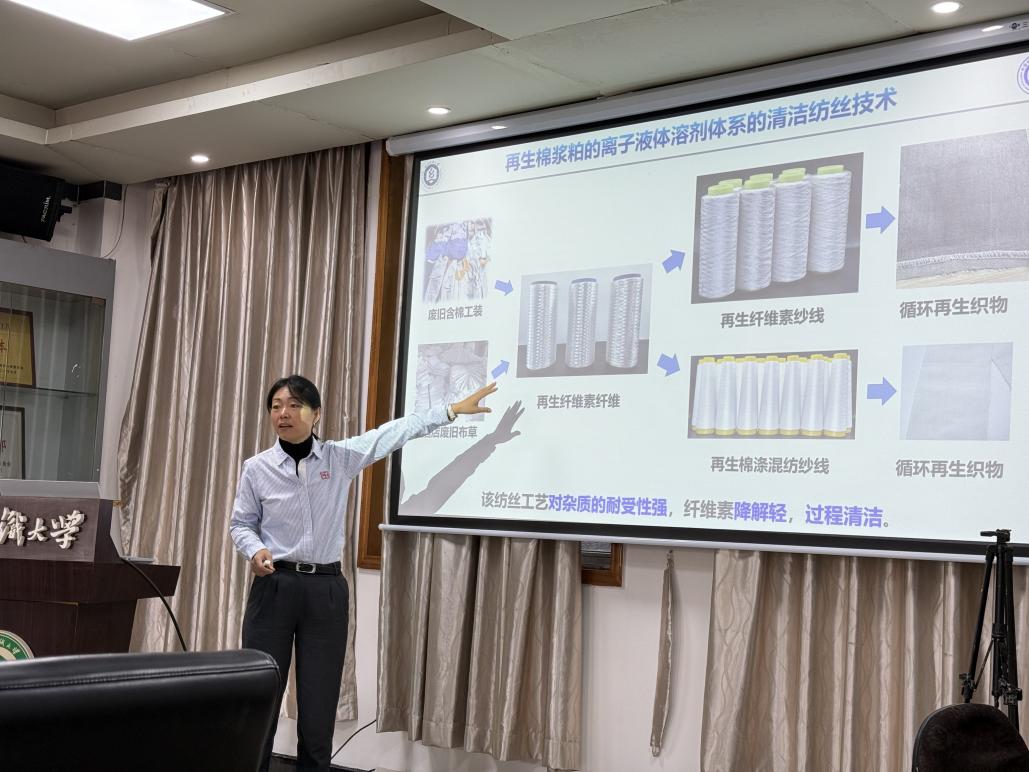 技术研究院国家地方联合工程实验室主任王金凤围绕“废旧纺织品回收再利用”这一主题,从技术创新、产业链构建到市场应用前景,全景式呈现了团队在该领域的系列研究成果。深入浅出的分享让与会人员对废旧纺织品循环经济的发展逻辑与实践路径形成了更立体、全面的认知。