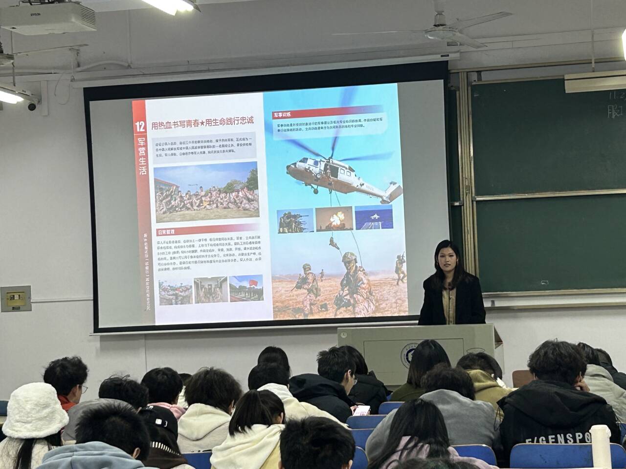 11月24日,服装学院在尚知楼108举办2026年春季征兵政策宣讲会,学校武装部征兵入伍宣讲员、22级优秀退役士兵杨佳慧担任主讲,2023级同学参加。