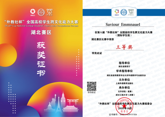 近日,我校留学生在2025年度第八届“外教社杯”全国高校学生跨文化能力大赛湖北赛区暨第四届“外教社杯”湖北省高校学生跨文化能力大赛(国际学生组)省赛中荣获省赛三等奖。该队伍由来自尼日利亚和加纳的Sunday Saviour Emmnauel、Phebe Hinson和Priscilla Ewusie-Ocran三位留学生组成。团队原创作品《润物无声》,以自身在武汉的学习经历和生活感受为切入点,展现家乡文化和中国文化的差异和共通,体会中国当下日新月异的巨大变化,深刻展现了其他文明眼中可信、可爱、可敬的中国形象。