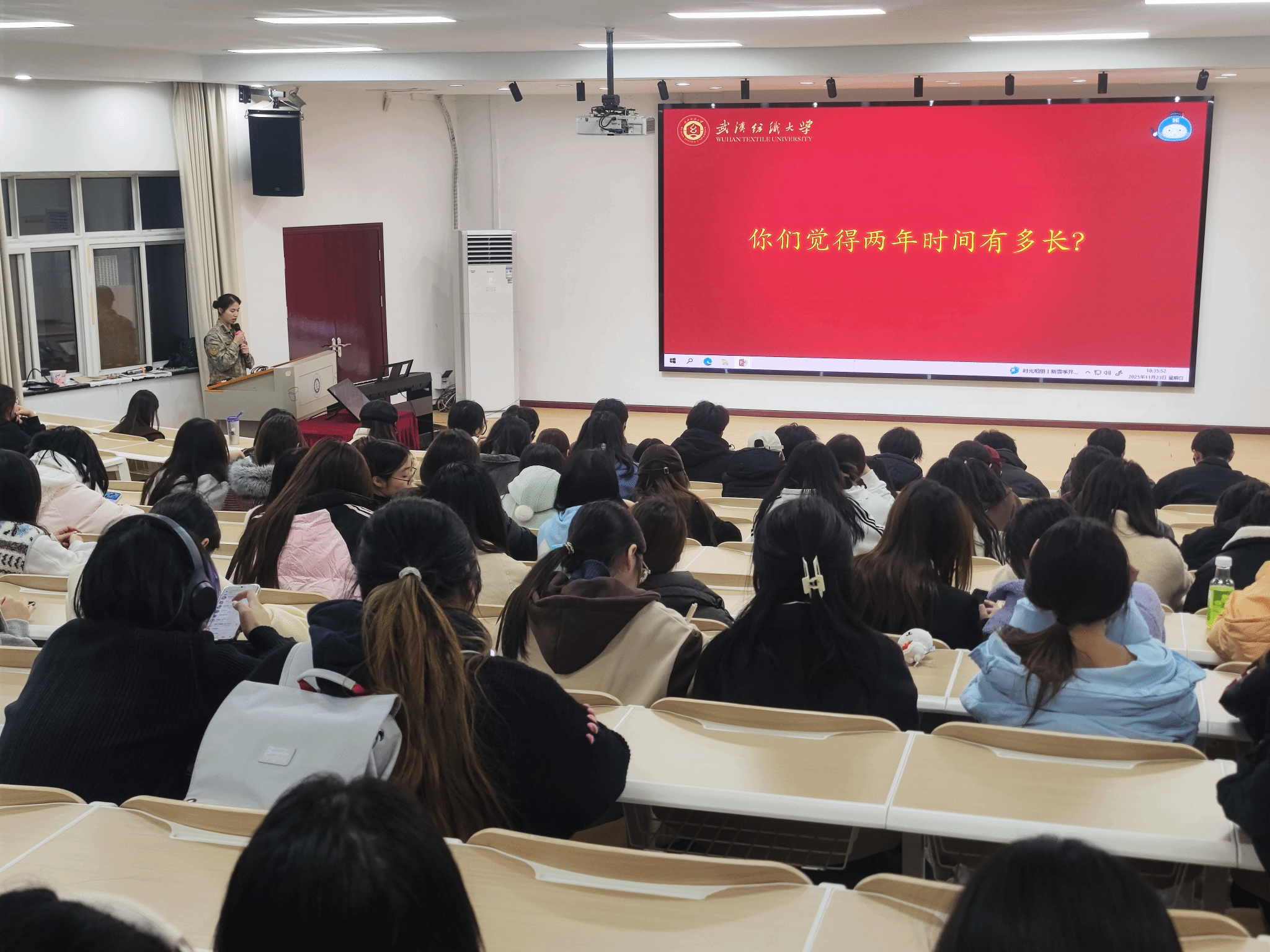 退役士兵陈雪静详细介绍了大学生参军相关优待政策,使同学们不仅了解到了家庭军属待遇、优先选拔使用、学费补偿和国家助学贷款代偿、退役后考学升学优惠、就业服务等相关政策,也激发了同学们参军入伍奉献国防的热血和热情。