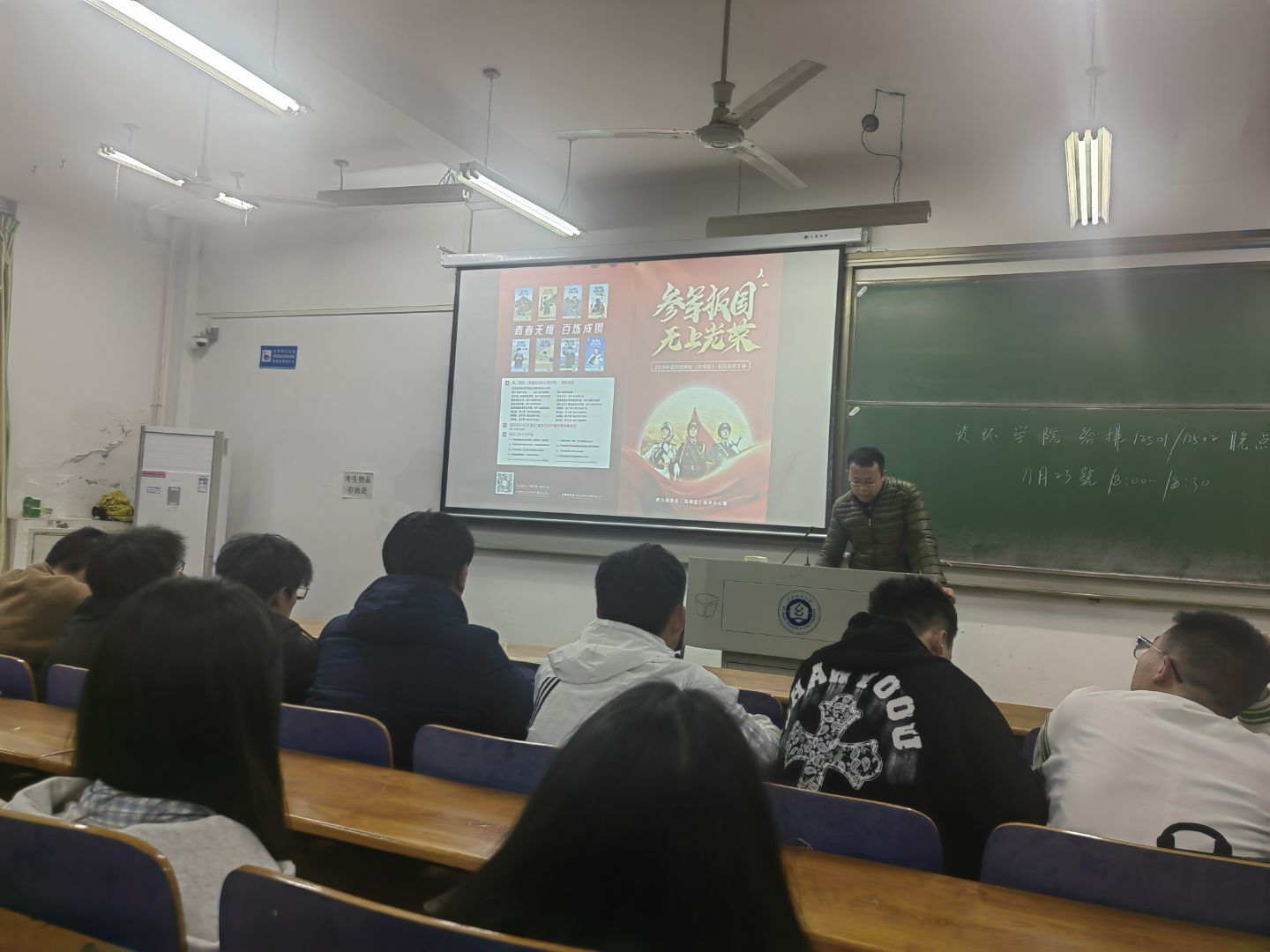 11月23日,副书记、各年级辅导员、班主任、退役士兵代表分年级、班级开展了“携笔从戎砺青春 热血报国正当时”主题班会暨征兵政策宣讲会。班会上,同学们集体观看了2026年征兵宣传片,老师们详细解读了入伍待遇、入伍条件、入伍流程环节,普及入伍常识,让同学们有了更为全面和深入的了解。