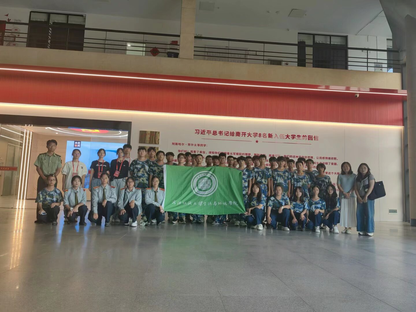 同时,为让同学们近距离感受军旅精神、了解国防事业发展现状,学院组织各年级学生前往学校国防教育馆进行参观学习,这里不仅有织物版与石头版月面国旗等“重量级”展品,还能看到徐卫林院士团队在航空航天纺织纤维领域的研究成果,从用于武器装备的特殊纺织材料,到见证纺织纤维变迁的军人服装,再到“身边的军功章”和优秀退役大学生士兵的故事,每一处都在诉说“纺织人”的国防情怀。对军事装备感兴趣的同学,还能近距离观摩国之重器展区的军兵种主战装备图、仿真武器模型,能让人直观感受大国力量。