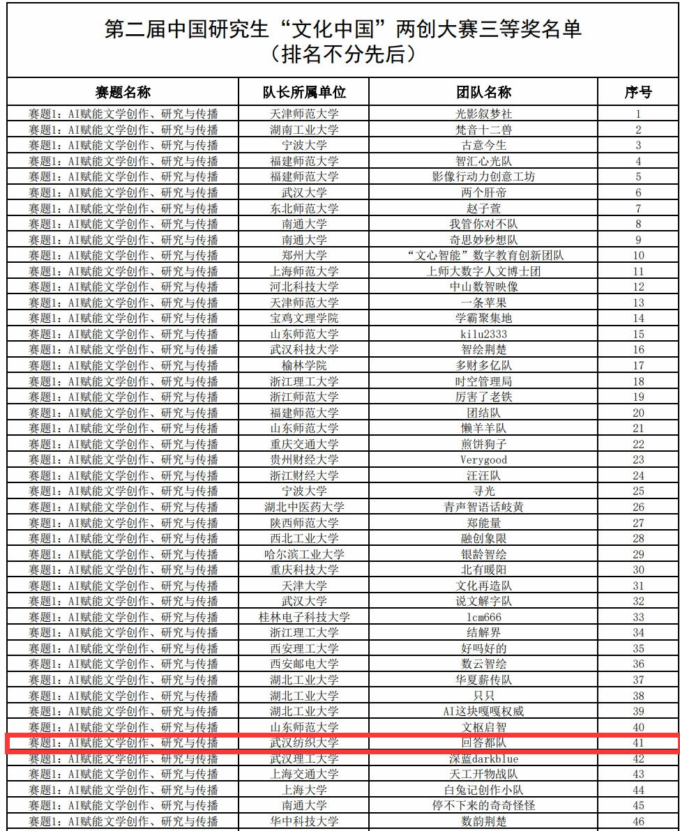 此次获奖是我院研究生创新实践能力的又一次展示。未来,学院将继续以学科竞赛为抓手,探索专业知识与AIGC等新兴技术深度融合的创新路径,为培养具有创新精神和实践能力的高层次人才搭建平台,推动研究生教育高质量发展,为文化强国建设贡献力量。