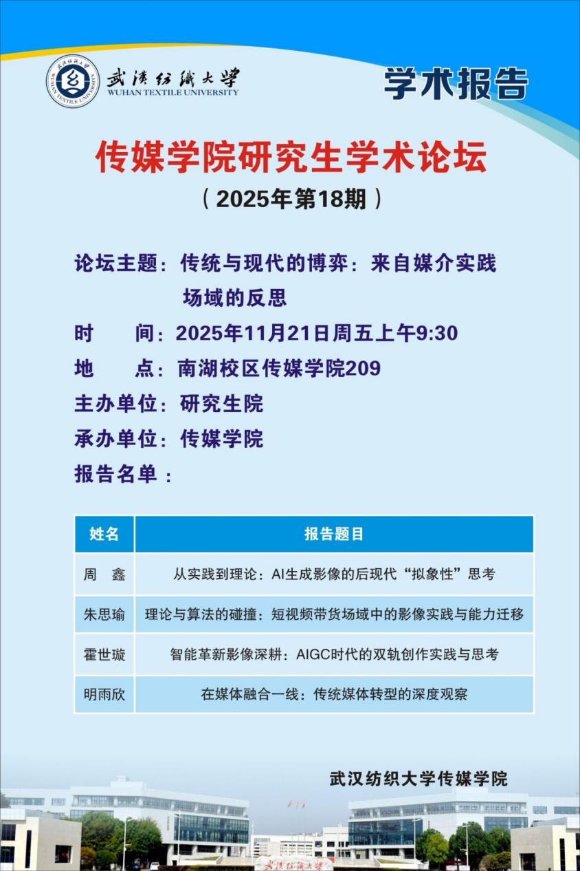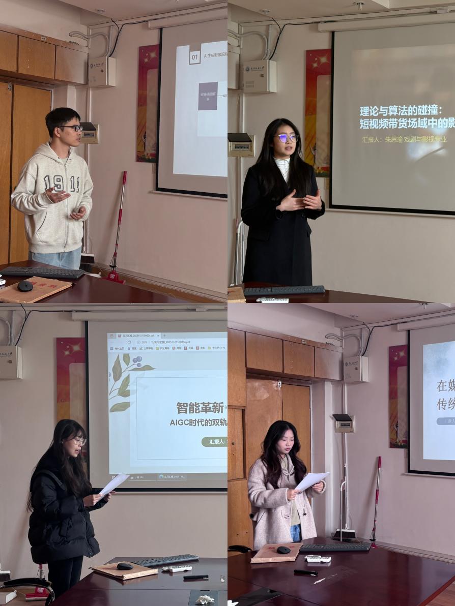 11月21日上午,传媒学院2025年第18期研究生学术论坛在308会议室举行。此次论坛以“传统与现代的博弈:来自媒介实践场域的反思”为主题,聚焦于媒介融合背景下的实践观察与理论思辨。报告人为2024级戏剧与影视专业的周鑫、朱思瑜、霍世璇,以及新闻与传播专业的明雨欣等四位同学,他们结合在湖北电视台纪录片部、海豚传媒、荆楚网等媒体的实习经历,分享了各自的实践感悟与理论思考。论坛由副院长马庆主持并点评。