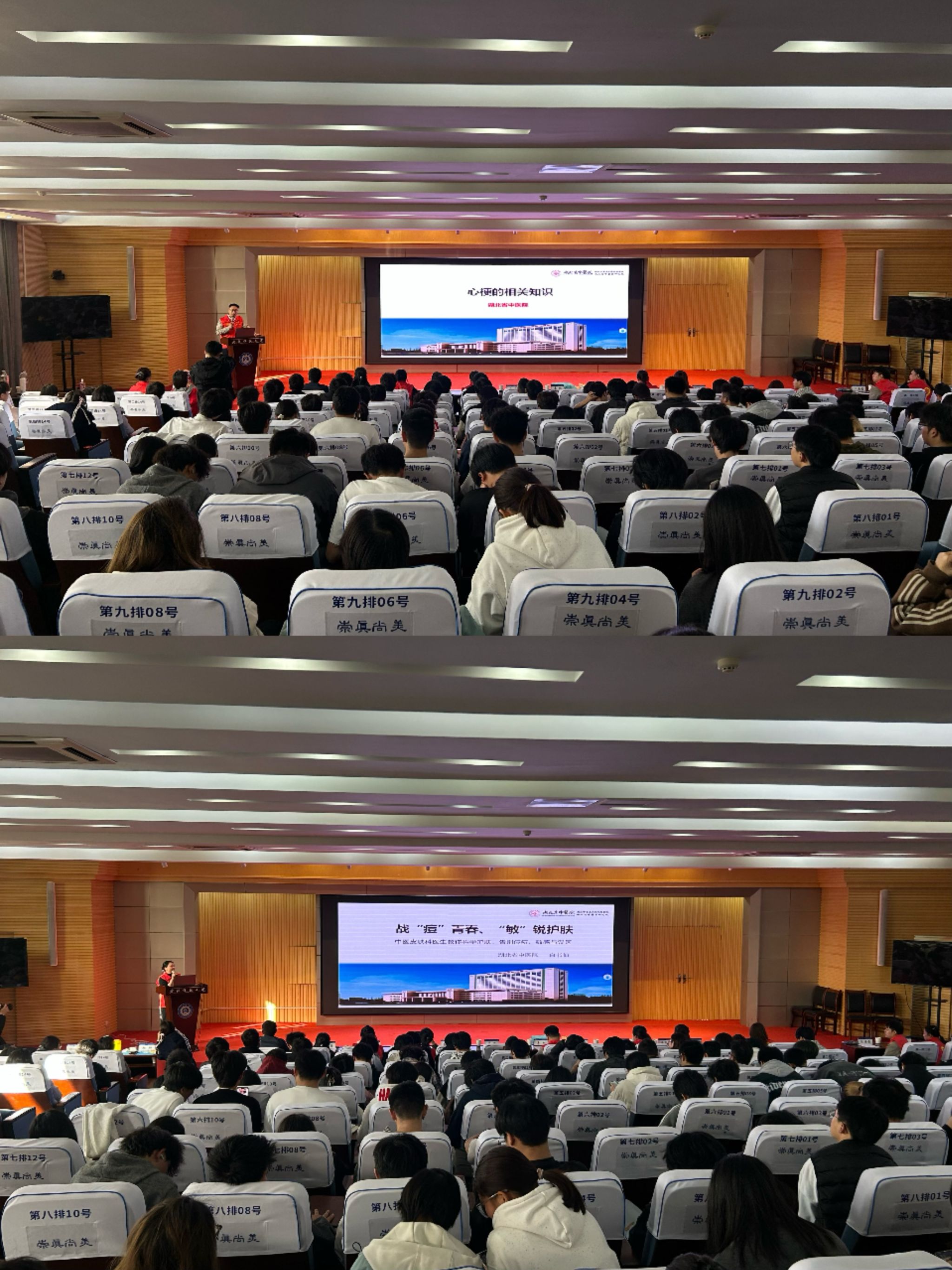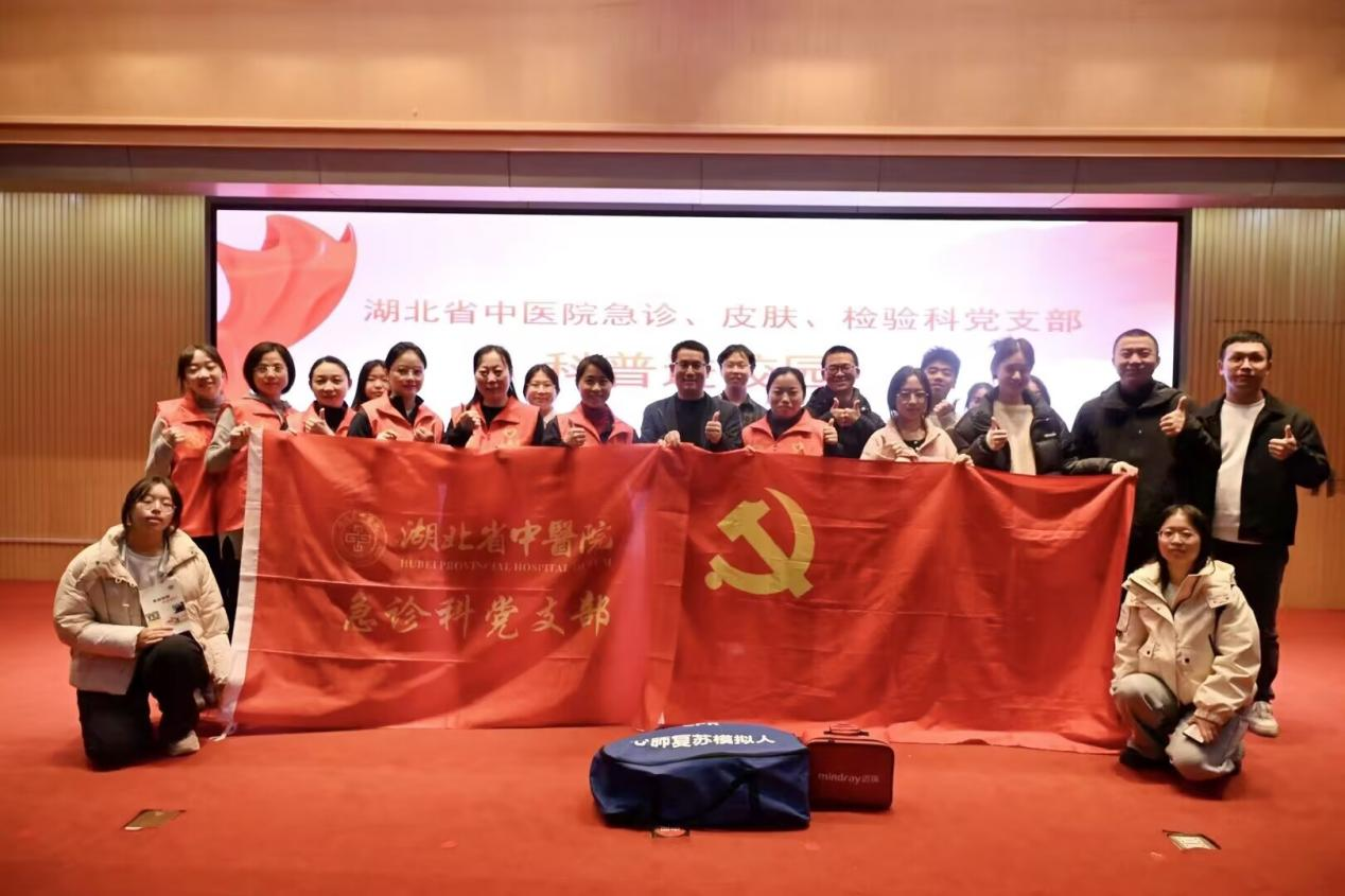 随后,湖北省中医院专家团队带来了一场内容丰富、干货满满的宣讲与培训:急诊党支部李刚主任细致解析急性心梗的识别要点与急救流程,让师生清晰掌握突发心脏疾病的科学应对方法;皮肤科党支部白书仙医生深入浅出讲解常见皮肤病的识别技巧与认知误区,助力大家科学区分皮肤问题、规避错误护理方式;护理专家吴雨曦借助办公操教学视频,带领现场师生起立跟随演示,并逐一讲解每个动作的发力要点与舒缓功效,让大家在实操中掌握缓解疲劳的实用方法;肖洁、黄明霞、张培、颜双双等急救专家详细讲解海姆立克急救技术、心肺复苏(CPR)及自动体外除颤器(AED)的使用要点,结合动作演示让核心操作流程更加通俗易懂;检验科技师饶珺同步提供现场血糖检测服务,为师生即时掌握自身健康状态提供贴心参考。