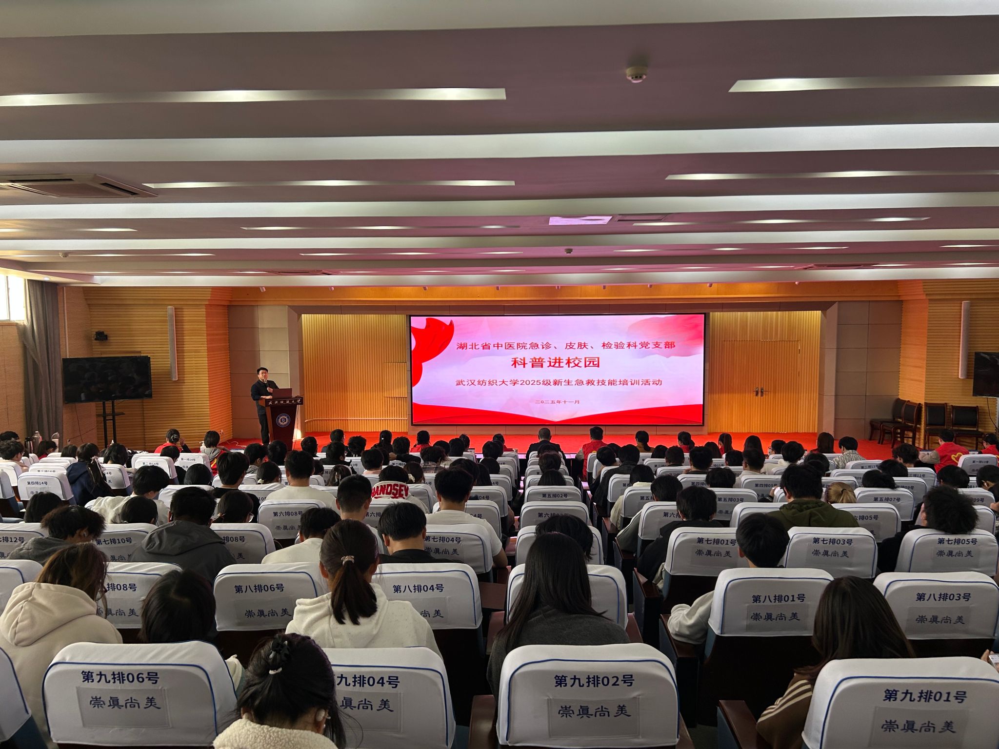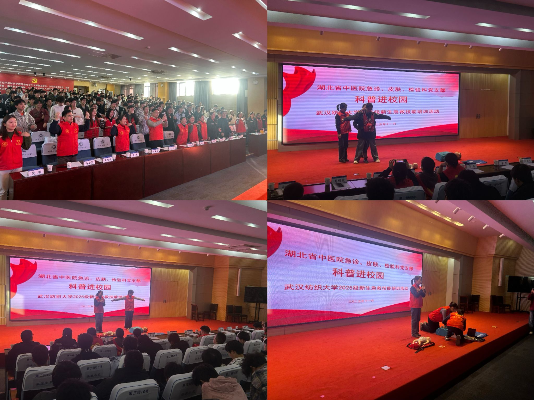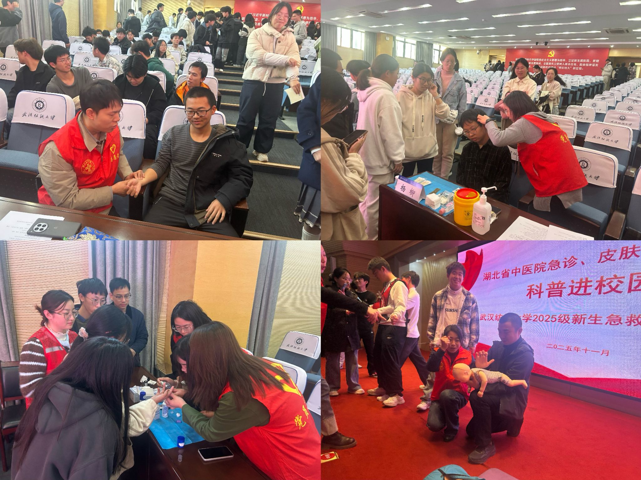 为提升师生急救知识储备与健康素养,增强应对突发状况的能力,11月27日下午,计算机学院联合校医院、湖北省中医院,在阳光校区国际学术报告厅开展“急救科普进校园”活动。活动中,湖北省中医院医疗专家(急诊科主任李刚,皮肤科、检验科、中医学等专家)、护理专家(急诊科护士长肖洁、120急救站站长黄明霞等)为学生带来一场生动形象的急救科普教育课。校医院副院长向玉桂,学院党委书记晏伟、党委副书记向涛,辅导员汤若釴、李港,“展翌”志愿服务队队员及2025级同学共同参与,活动由学院学生安全工作组组长廖龙主持。
