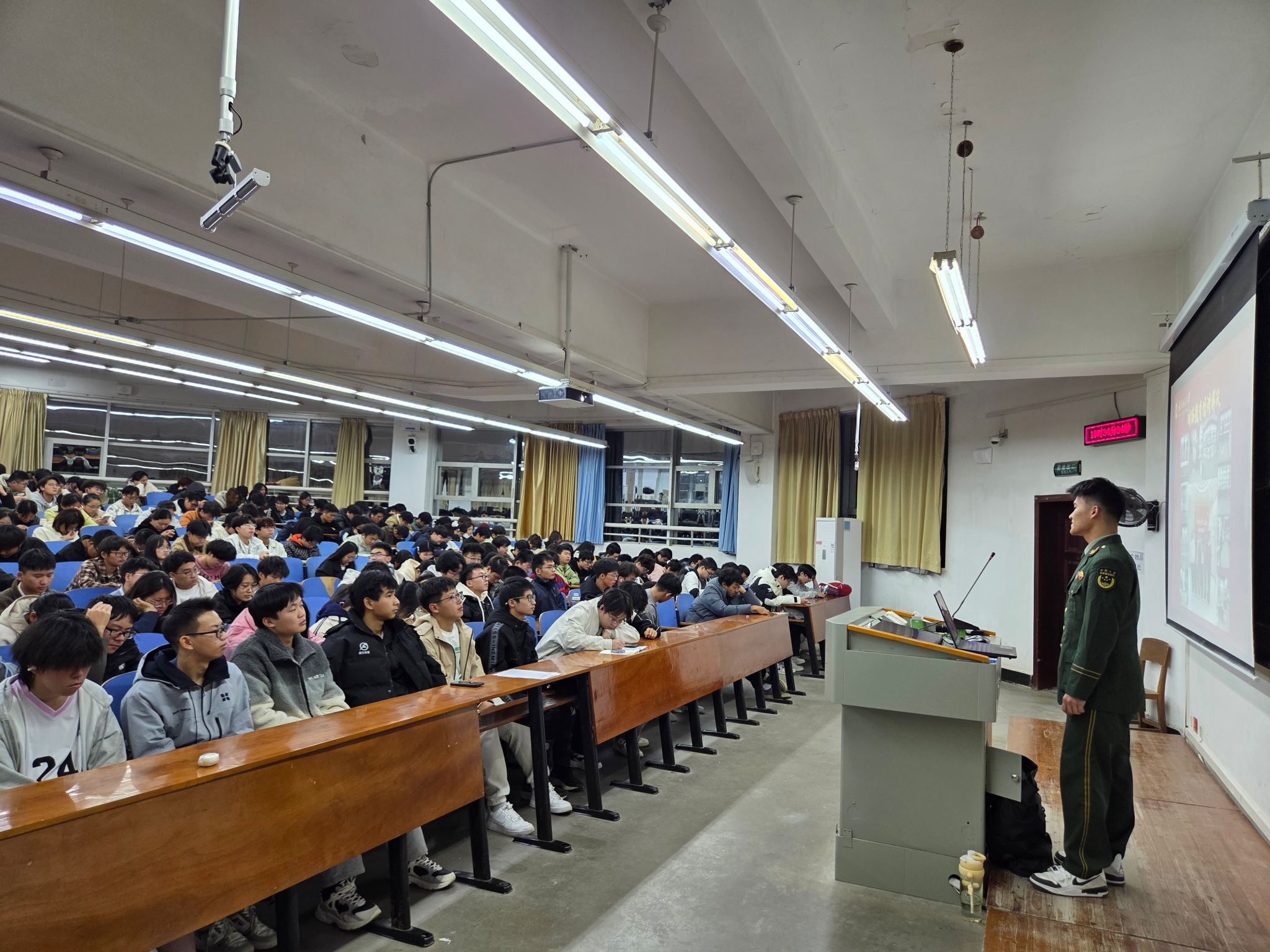 各年级以“携笔从戎砺青春,热血报国正当时”为主题召开了年级大会和班会。会上,各年级班主任、辅导员分别做入伍政策宣讲,详细介绍了2026年征兵报名时间、入伍基本条件等内容,鼓励同学们积极报名,为同学们答疑解惑。同时,对大学生参军的学费补偿、升学优待、就业安置等优待政策进行了重点解读。