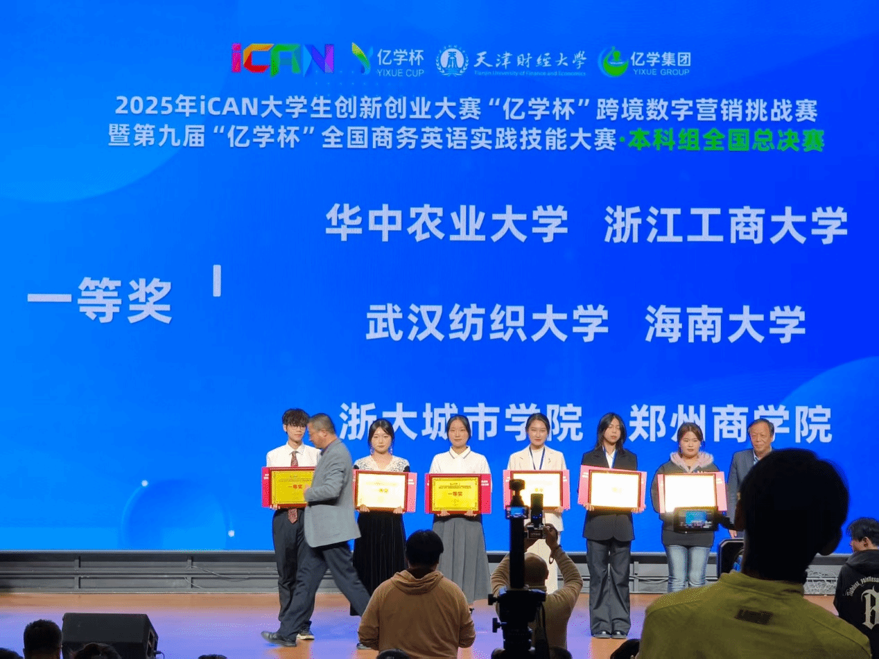 11月30日,由中国国际商会商业行业商会主办的2025年iCAN大学生创新创业大赛“亿学杯”跨境数字营销挑战赛本科组全国总决赛暨第九届“亿学杯”全国商务英语实践技能大赛总决赛(本科组)圆满落幕。