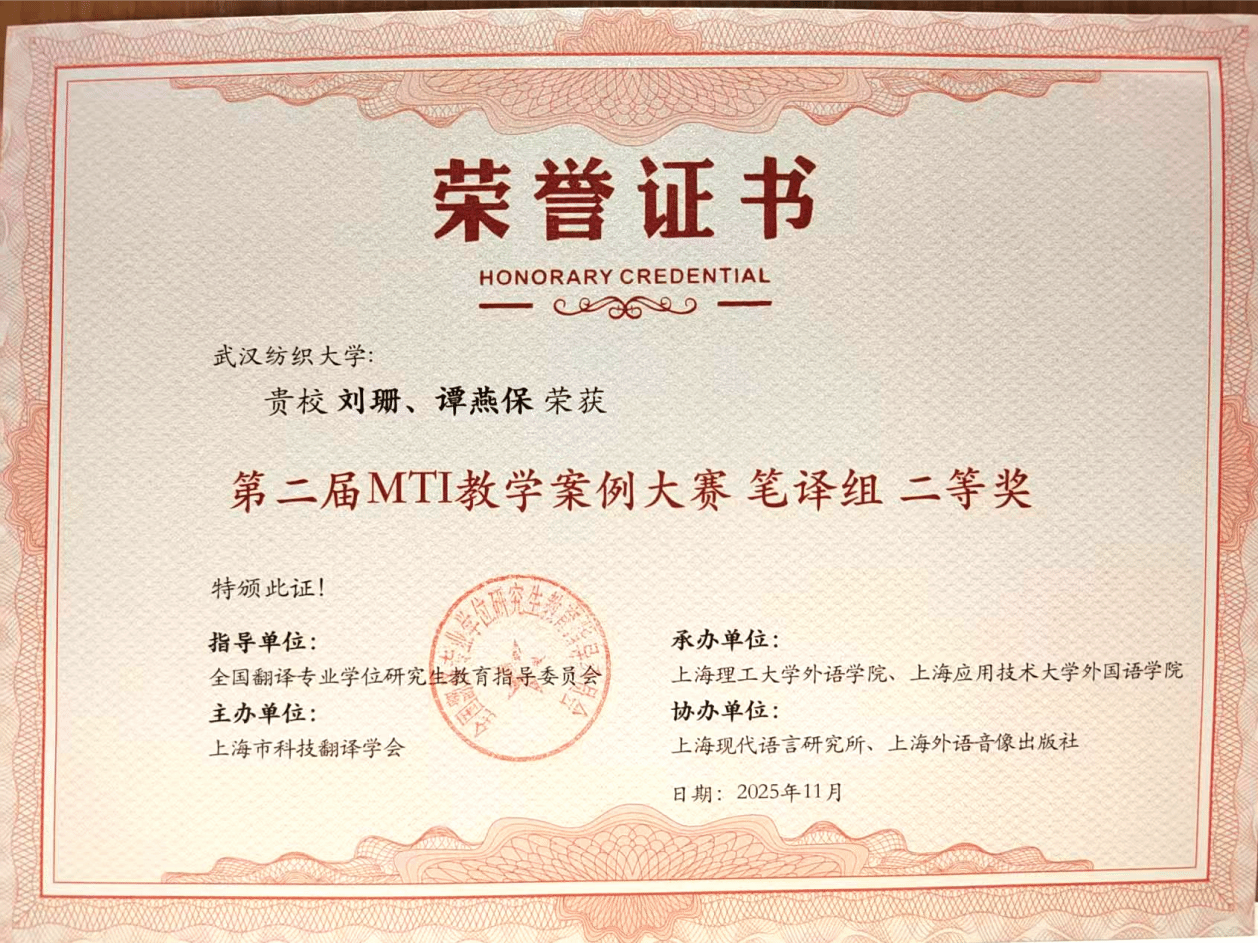 外国语学院翻译硕士(MTI)教育充分发挥专业特色以及学校多学科交叉优势,逐步构建起以纺织服装翻译为聚焦方向的应用型、专业化人才培养模式。此次外国语学院在竞赛中获得荣誉,充分体现了学院在专业学位研究生培养机制创新、翻译实践教学模式探索以及产学研协同育人等方面取得的扎实成效。学院将以此为新起点,进一步推进MTI教学改革,优化课程体系设计,全面提高翻译人才的综合素养与实务能力,致力于对接国家战略需求,助力区域产业升级与社会发展,持续推动学术研究、人才培养与社会服务三者深度融合、协同共进。