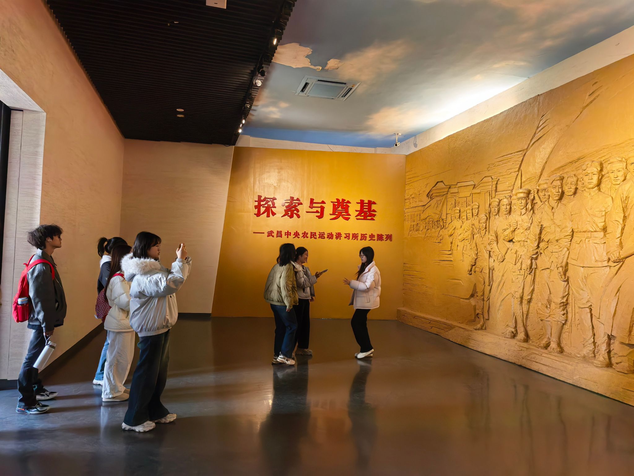 在武昌农民运动讲习所旧址纪念馆,青砖灰瓦的古朴建筑庄严肃穆,这里曾是毛泽东同志主办农讲所、培养农民运动骨干的重要基地。在专业讲解员的引导下,大家先后参观教务部、学员宿舍等历史场景,凝视泛黄的《中国农民问题》讲义、学员自制的油灯等文物,深入了解1927年前后毛泽东、恽代英等革命先辈在此授课讲学、培育革命力量的光辉历程。在讲习所操场,大家仿佛能感受到当年学员们刻苦训练、立志报国的激昂氛围,深刻体悟到革命先辈在艰苦环境中坚守信仰的奋斗精神。