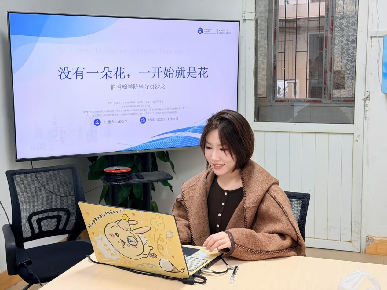会上,伯明翰学院辅导员张老师以“没有一朵花,一开始就是花”为主题,分享了学生成长培育的工作理念。她以“花的生长”为喻,将学生视为种子,提出四阶段育人路径:系统定位助力“破土”,生涯规划引导“发芽”,生态理念推动“散叶”,内外联动静待“花开”。张老师表示,教育是“心心相印的活动”,应以耐心、细心与爱心浇灌,通过多元评价、包容试错、关注过程,助力学生茁壮成长。她呼吁以“百花齐放”的视角陪伴学生成长,展现出一线思政工作的温度与智慧。