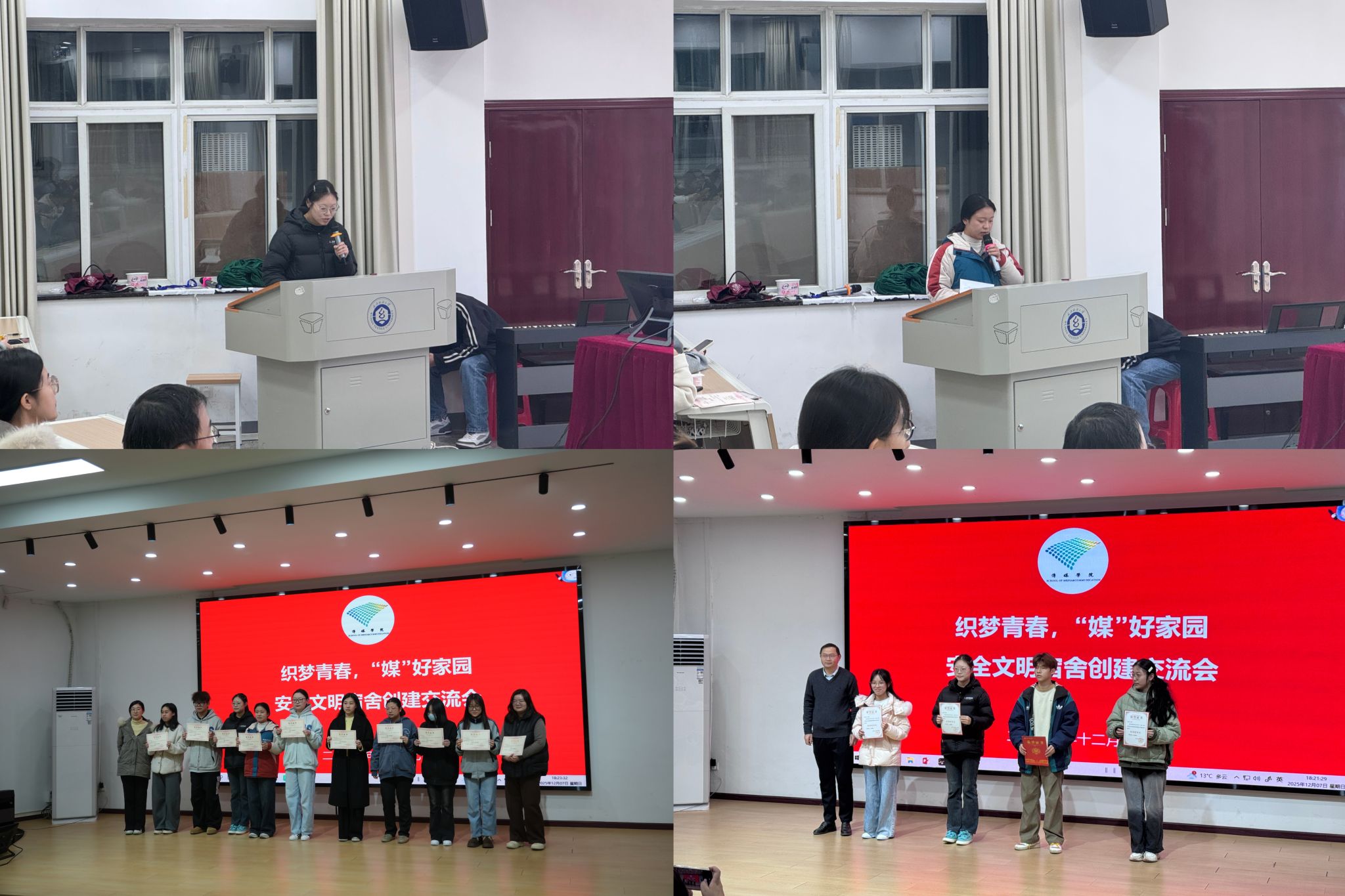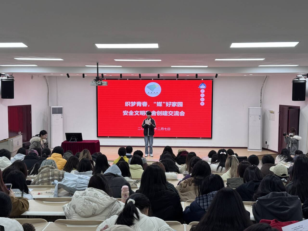 12月7日晚,南湖校区“一站式”学生社区“青春会客厅”内暖意融融,“织梦青春,‘媒’好家园”安全文明宿舍交流分享会在此温馨启幕。学院党委副书记刘登冉、全体辅导员、优秀寝室代表与2025级全体学生齐聚一堂,以经验分享为桥,共话寝室建设的暖心之道与成长之策。
