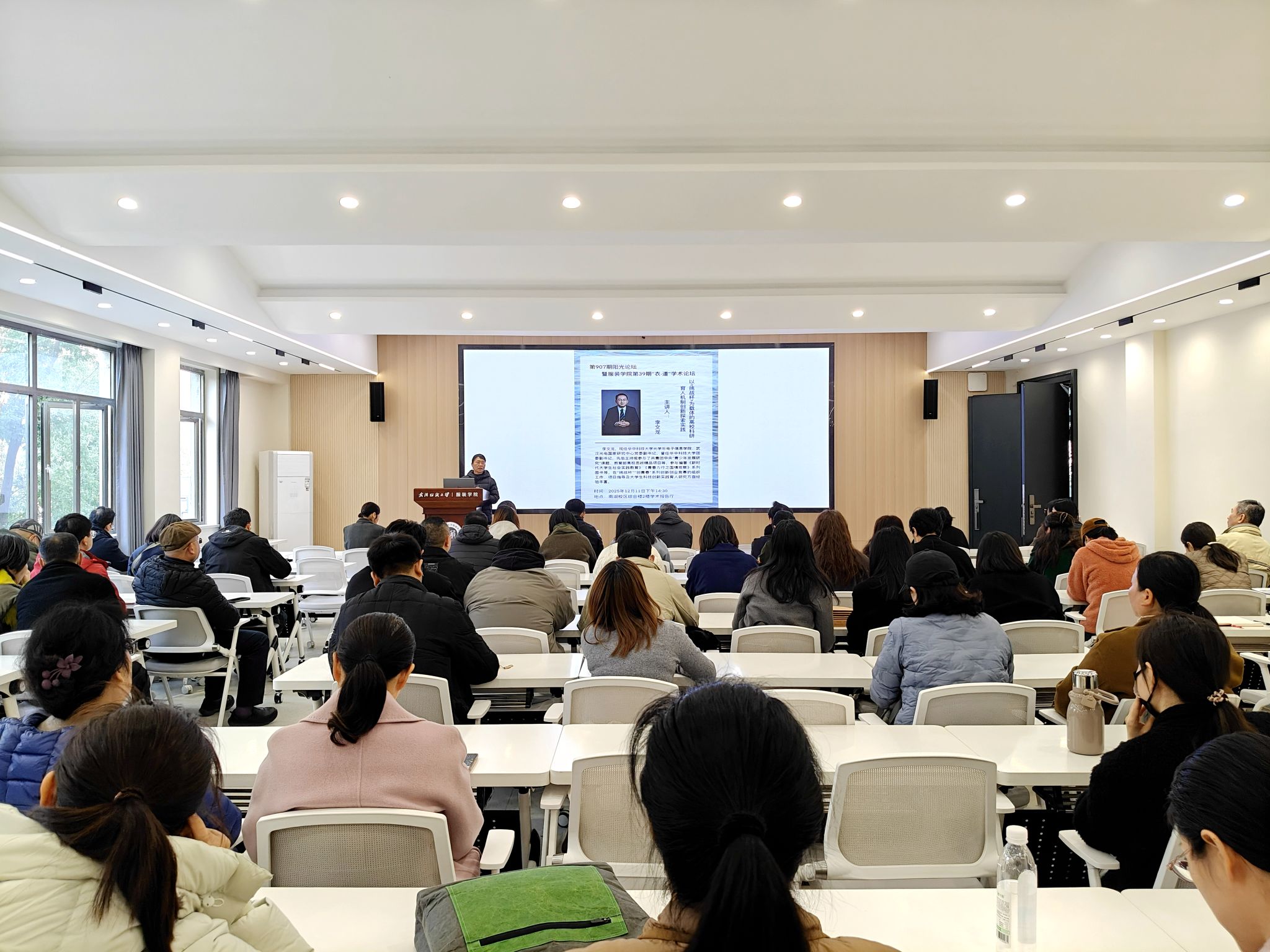 12月11日下午,服装学院在南湖校区尚知楼二楼学术报告厅举办了“挑战杯”专题报告会。本次报告会由华中科技大学光学与电子信息学院、武汉光电国家研究中心党委副书记李文龙主讲,旨在深化“以赛促教、以赛育⼈”理念,为学院备战各类科创赛事夯实基础。学院全体教职工参加了本次报告会,会议由服装学院院长陶辉主持。