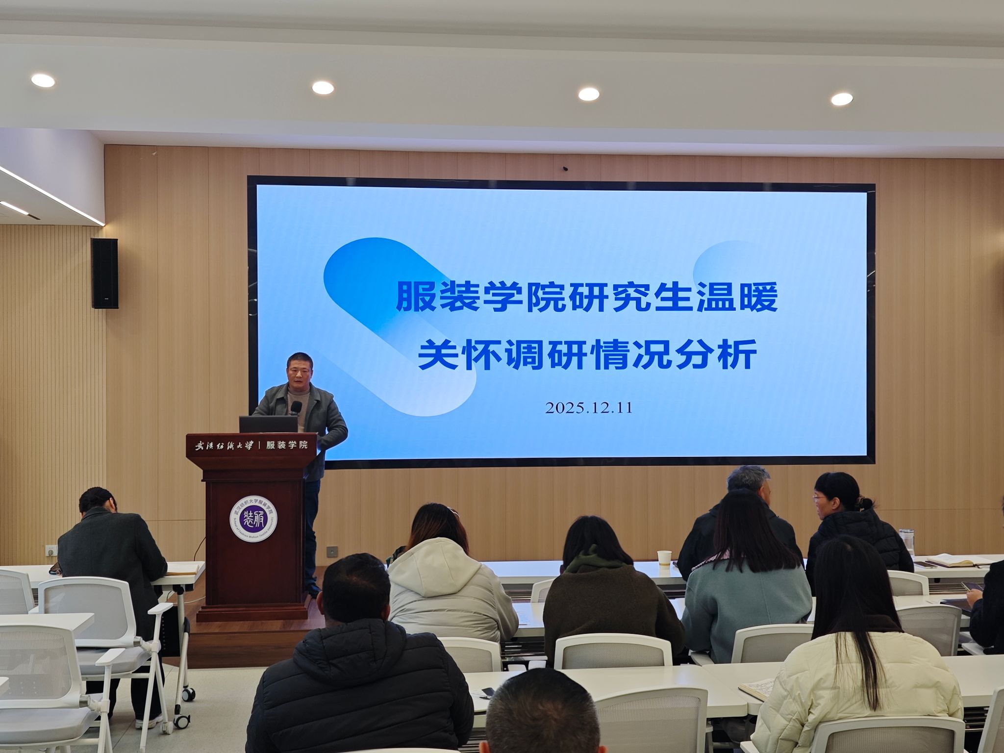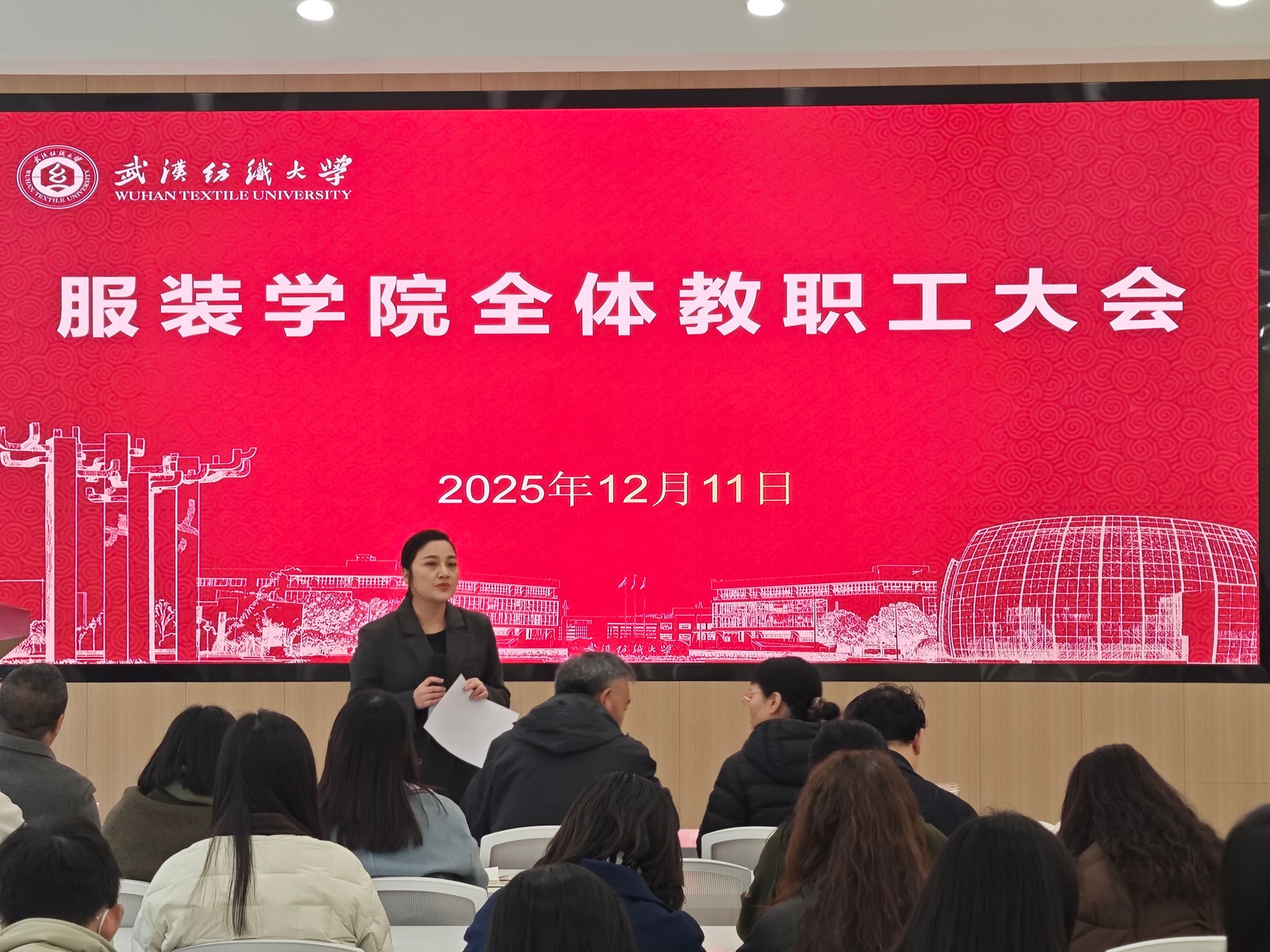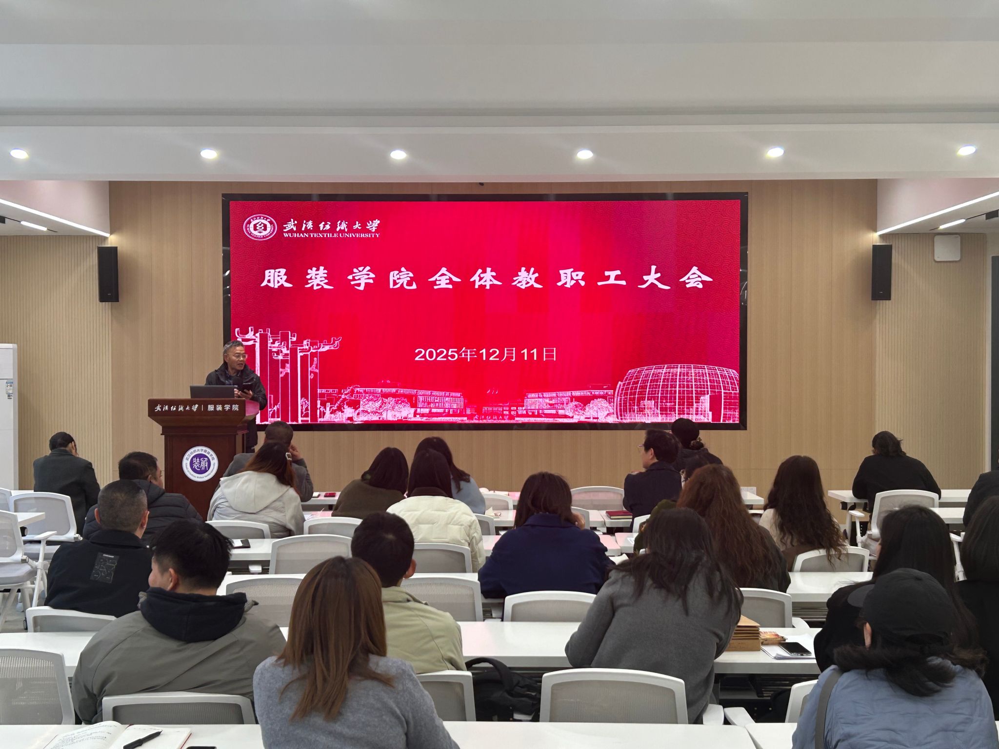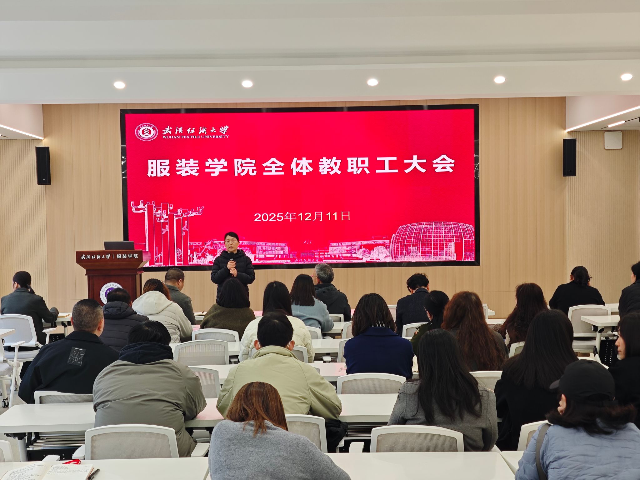 12月11日,服装学院在尚知楼二楼学术报告厅召开全院教职工大会。学院领导班子成员及全体教职工参会,会议由院长陶辉主持,围绕师德师风建设、教学科研、人才培养等核心工作,系统部署近期重点任务,进一步统一思想、压实责任,为学院高质量发展和学校“双一流”建设夯实基础。