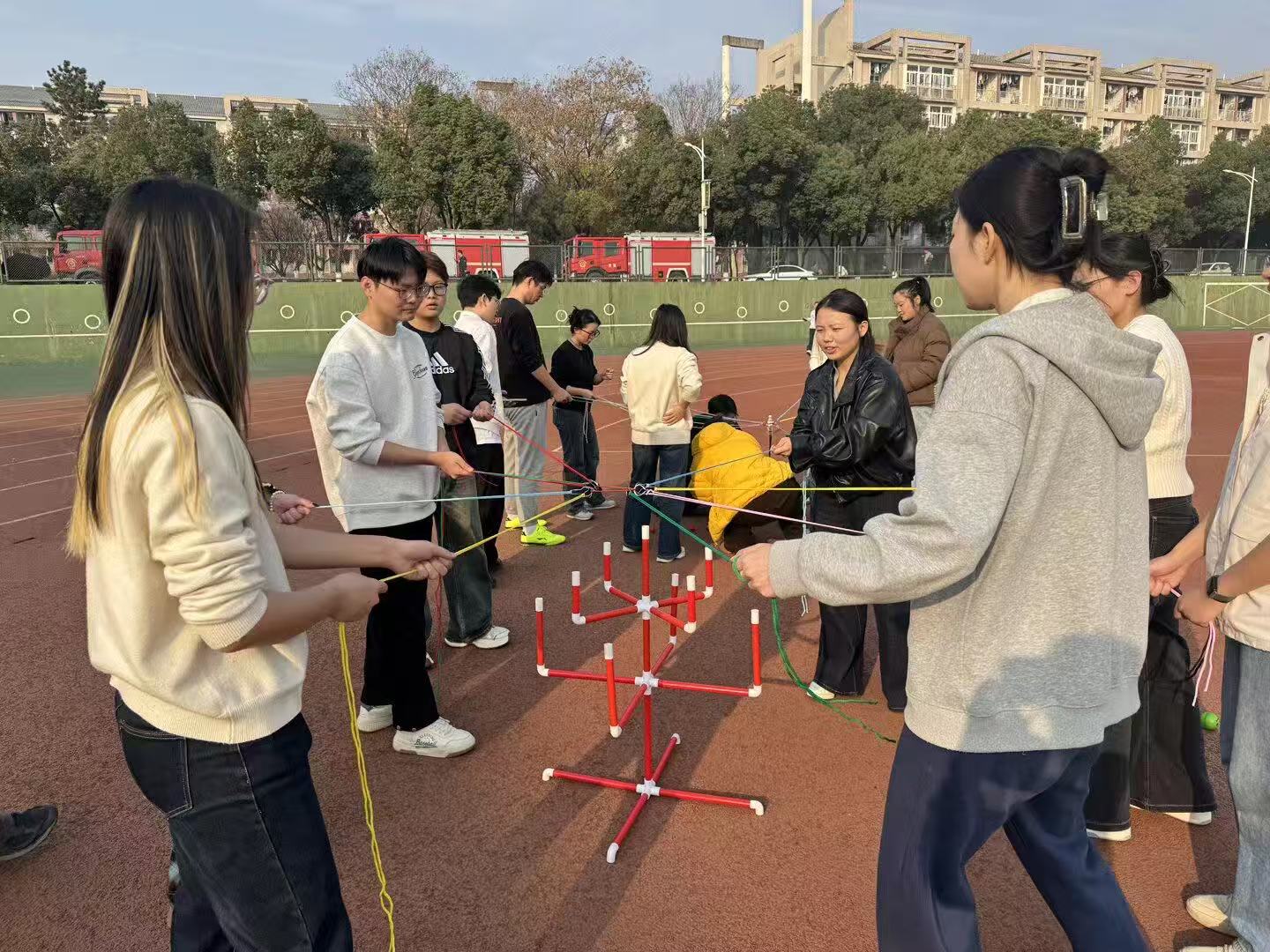 核心游戏环节设置丰富多样,6支队伍同台竞技、默契配合。“珠行万里”考验队员衔接协作,大家手持PC管精准传递网球,在欢声笑语中攻克球不掉落的难关;“合力建塔”与“团队金字塔”要求队员通过绳索默契操控,在有限时间内搭建积木、运送小球,充分展现了统筹规划与分工协作能力;“两人三足踩气球”“光盘拔河”等对抗性游戏中,队员们互帮互助、奋勇争先,既释放了学习压力,又加深了彼此信任;“撕名牌”与“投壶”并行开展,既有激烈角逐的热血瞬间,也有从容投掷的休闲时刻,让不同性格的同学都能充分参与。