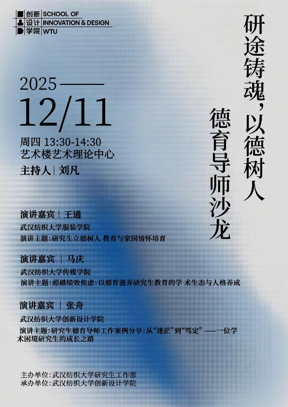 为系统构建德育导师与研究生的良性互动模式,切实提升育人工作的针对性与实效性,12月11日下午,由研工部主办、设计学院承办的以“研途铸魂,以德树人”为主题的德育导师沙龙在创新设计学院艺术理论中心顺利举行。本次沙龙邀请传媒学院副院长马庆、服装学院德育导师王通、设计学院德育导师张舟主讲,创新设计学院副院长刘凡主持,学院德育导师及研究生代表参加此次活动。