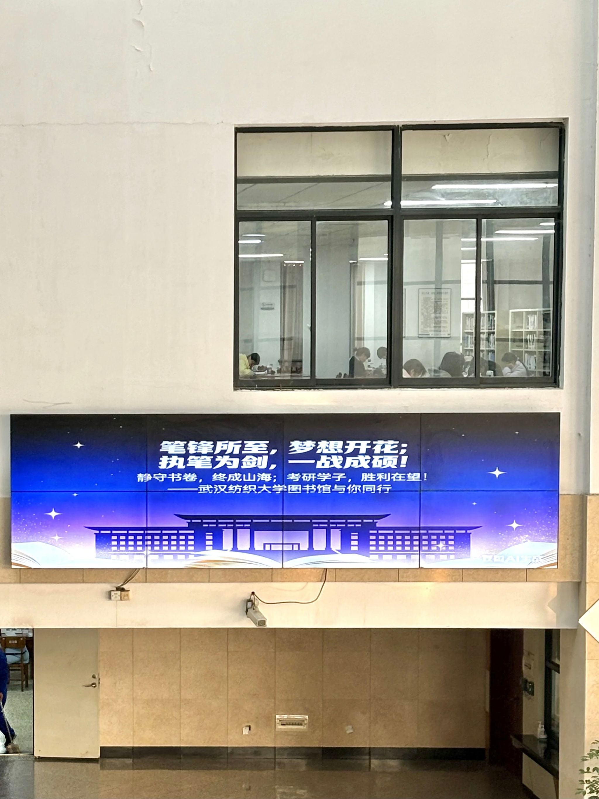 走进图书馆二楼大厅,显示屏上“笔锋所至,梦想开花”等励志话语,为考研学子加油打气。